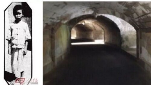 左图:幼小的彭士禄;右图:石炮台监狱,这张照片是当时国民党专门让8岁的彭士禄在石炮台监狱门口拍的,目的是为了登报邀功,当时标题是《澎湃之子被我第九师捕获》