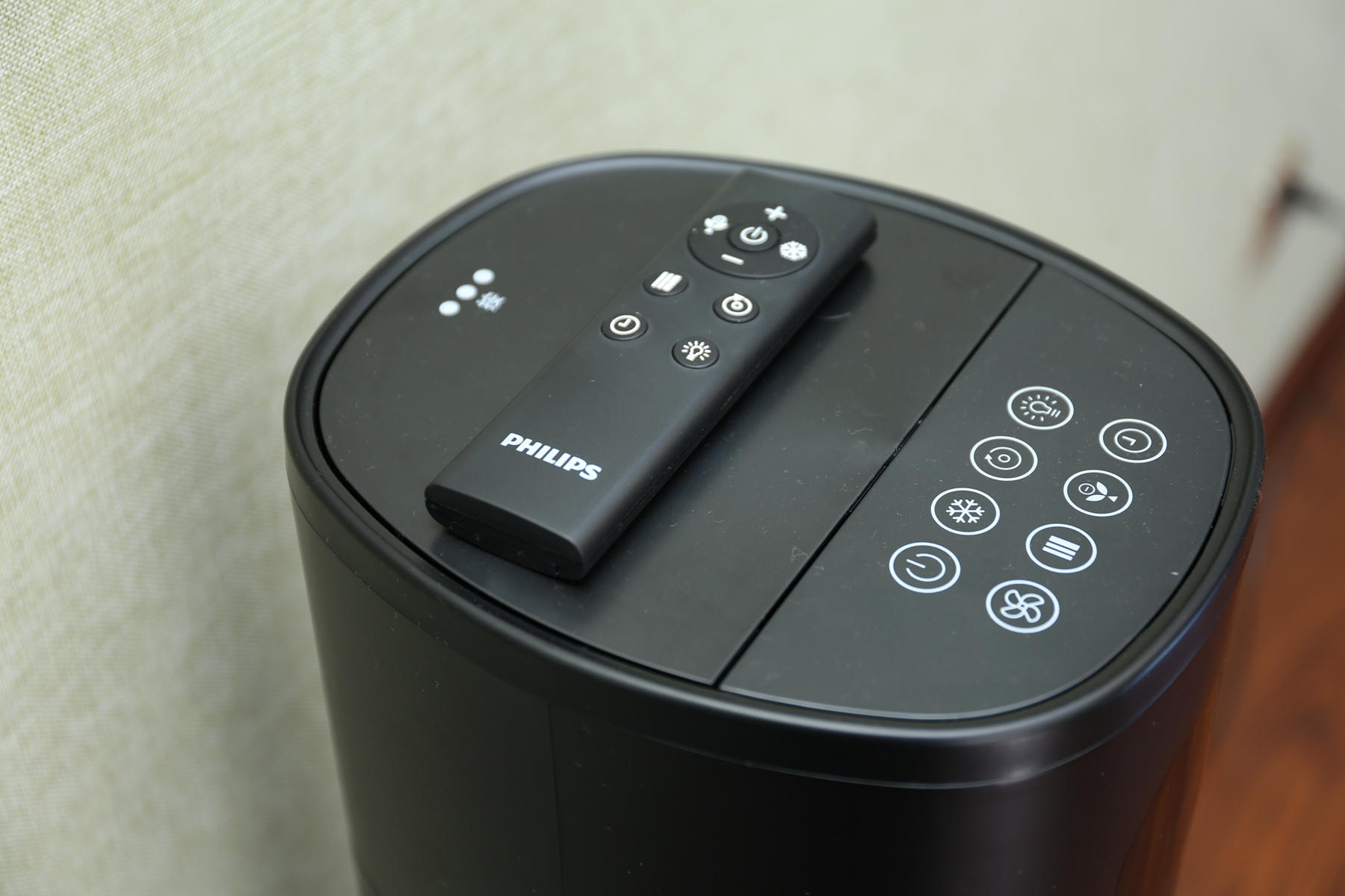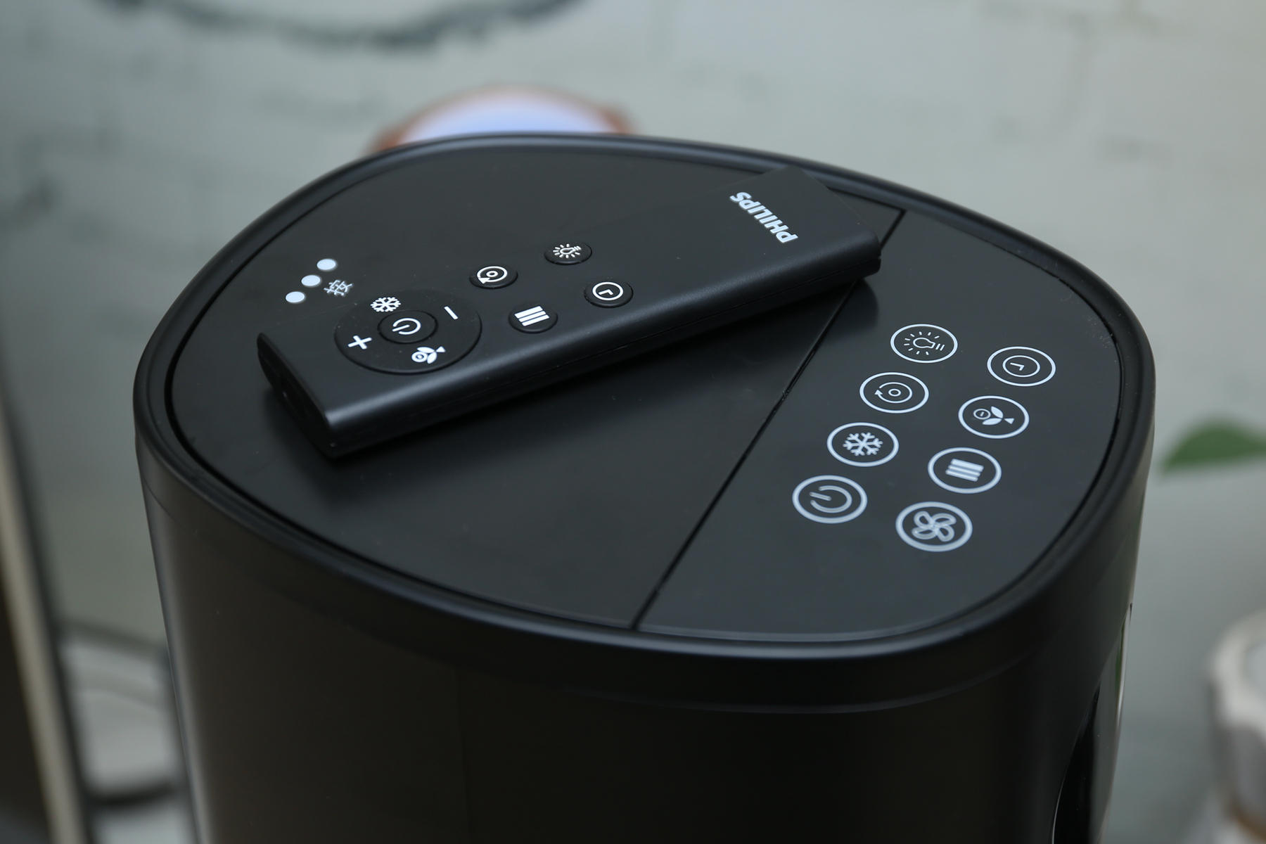 飞利浦ACR3144BT给用户配备了一块遥控器,其功能和设备按键功能是一样的,能够调节设备风速(1~12档),风类(标准、自然、睡眠),设计了显示屏“一键息屏”能够很好的解决夜间显示屏干扰睡眠的情况发生。当然什么定时(1~24小时分段定时),负离子净化功能都是有的。