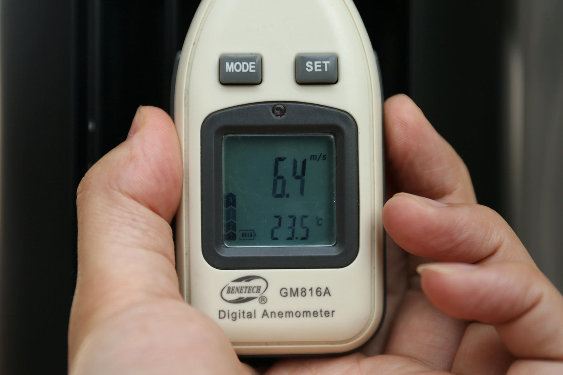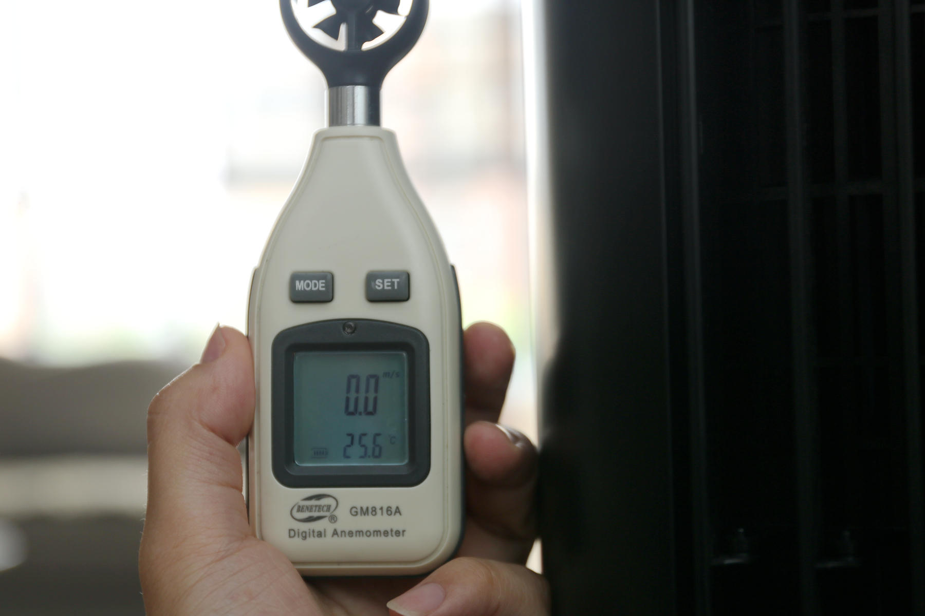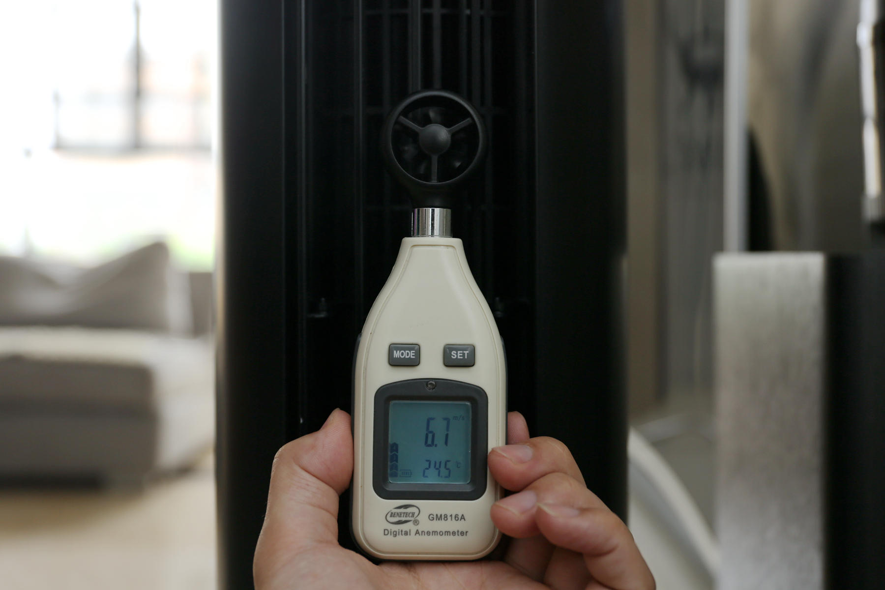 在默认的吹风模式下,最大12档模式,我能能够看到实测6.7m/s,由于手晃动,以及出风口比较大的缘故,并不是最高值,标准的吹风模式实测温度为24.5℃,将空气温度下降了1.1摄氏度左右。和传统风扇相比,由于叶扇原理有点差别,实测叶扇温度为24.7℃,标准模式下说明差别不大,温度主要取决于室内空气温度。