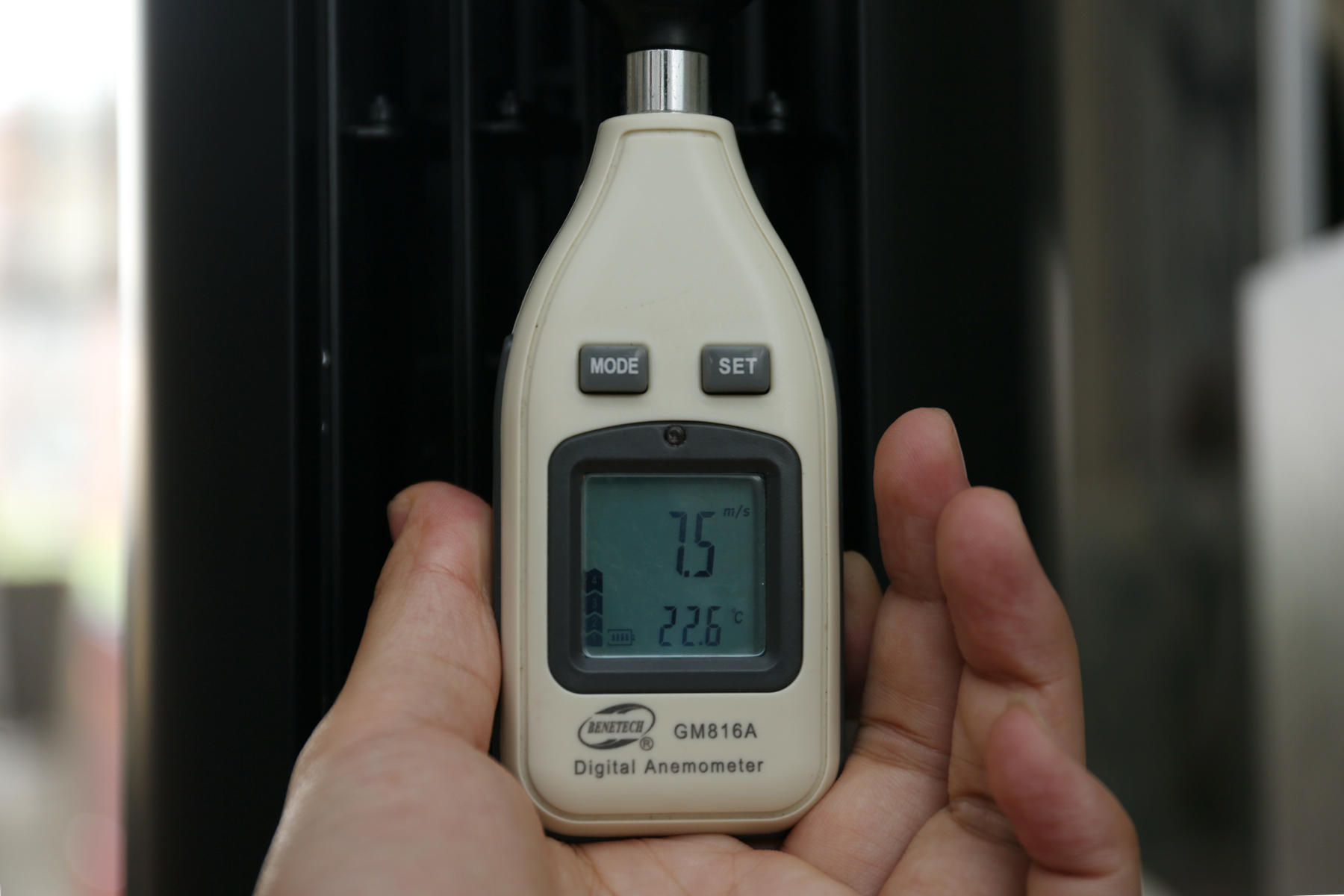 飞利浦ACR3144BT空调扇这款产品采用的是12档风速,三个风类设计,实测12级最大直吹风模式下,吹出风速实测是7.5m/s,环境温度大概是25.6摄氏度左右。