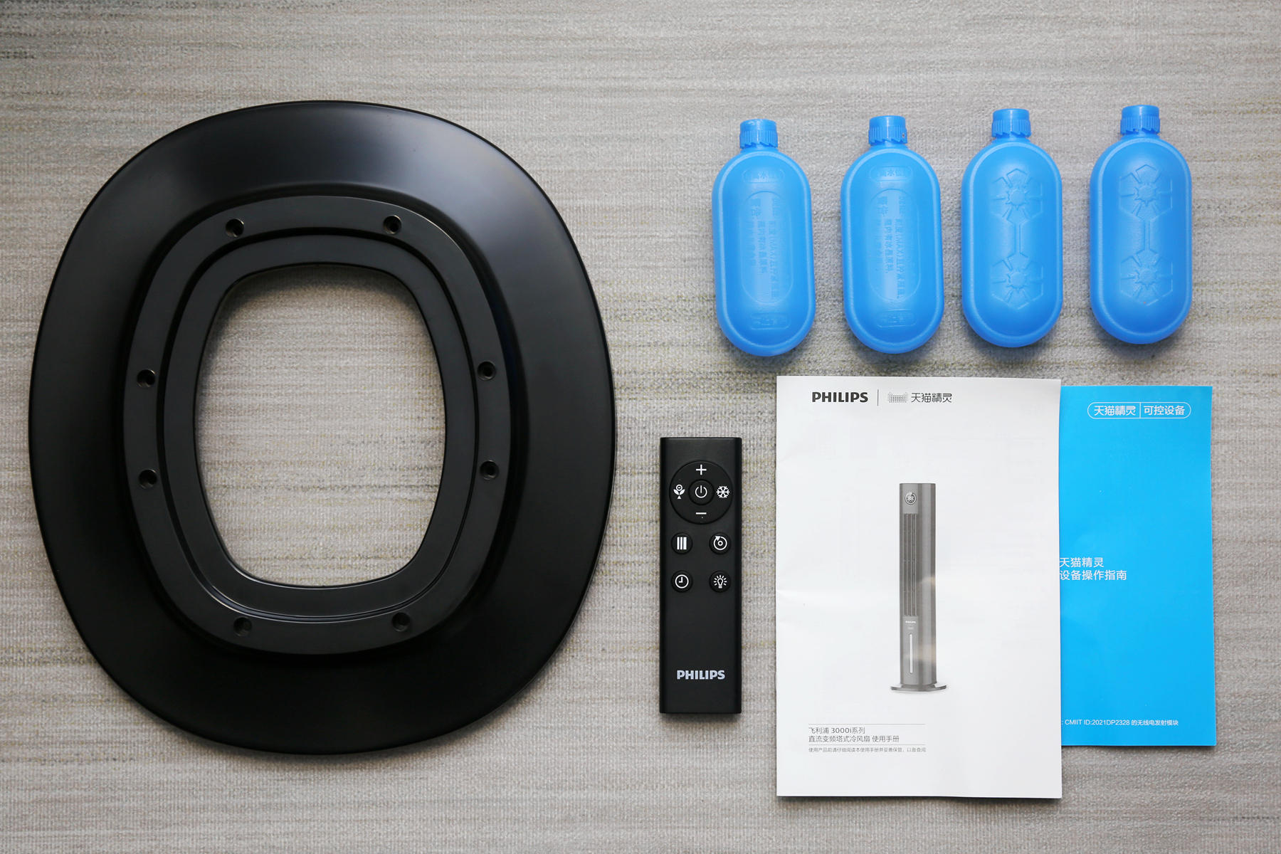 除了飞利浦ACR3144BT空调扇主机之外,配件方面还有一个需要手动安装的底座支架,四个冷冻包,一个遥控器外加一份说明书和一张天猫精灵的连接指南。