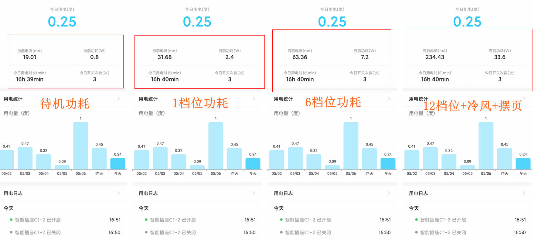 解暑效果给大家展示了后,相信不少小伙伴会问,这个功耗应该很夸张吧?我这里没有标准的能耗测试工具,用的是一个电量版智能插座测试,结果仅供参考:待机功耗0.8瓦,1档功耗2.4瓦,6档常规状态功耗7.2瓦,12档+冷风+摆页模式下的实测功耗为33.6瓦,也就是说最大功耗在33.6瓦左右,这个能耗大家还满意吗?
