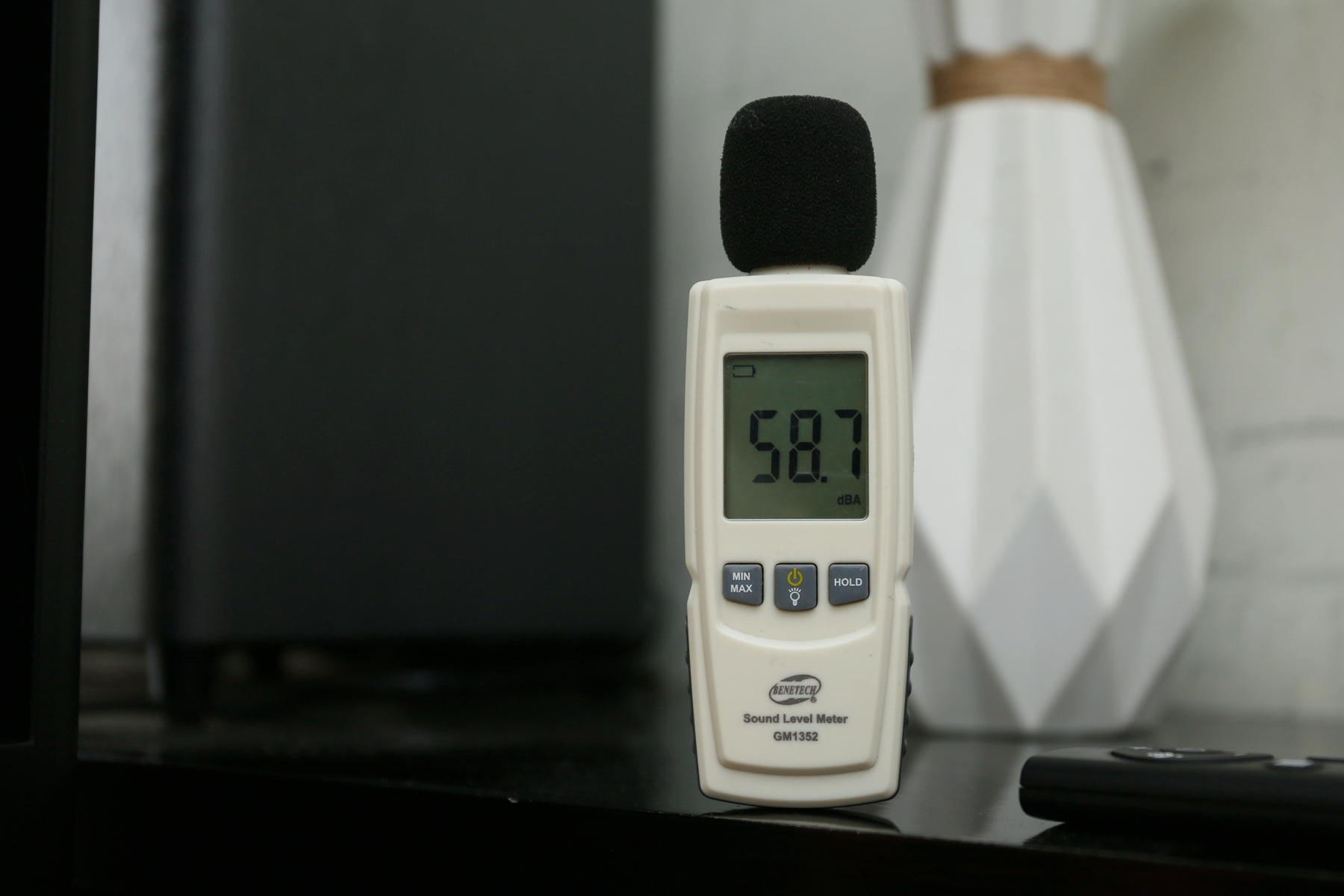 实测12最高档位模式下,设备旁边的环境噪音为58.7分贝,如果贴着设备应该是在60分贝左右,距离设备2~3米左右基本就没啥感觉,噪音控制下确实感觉还挺满意的说。
