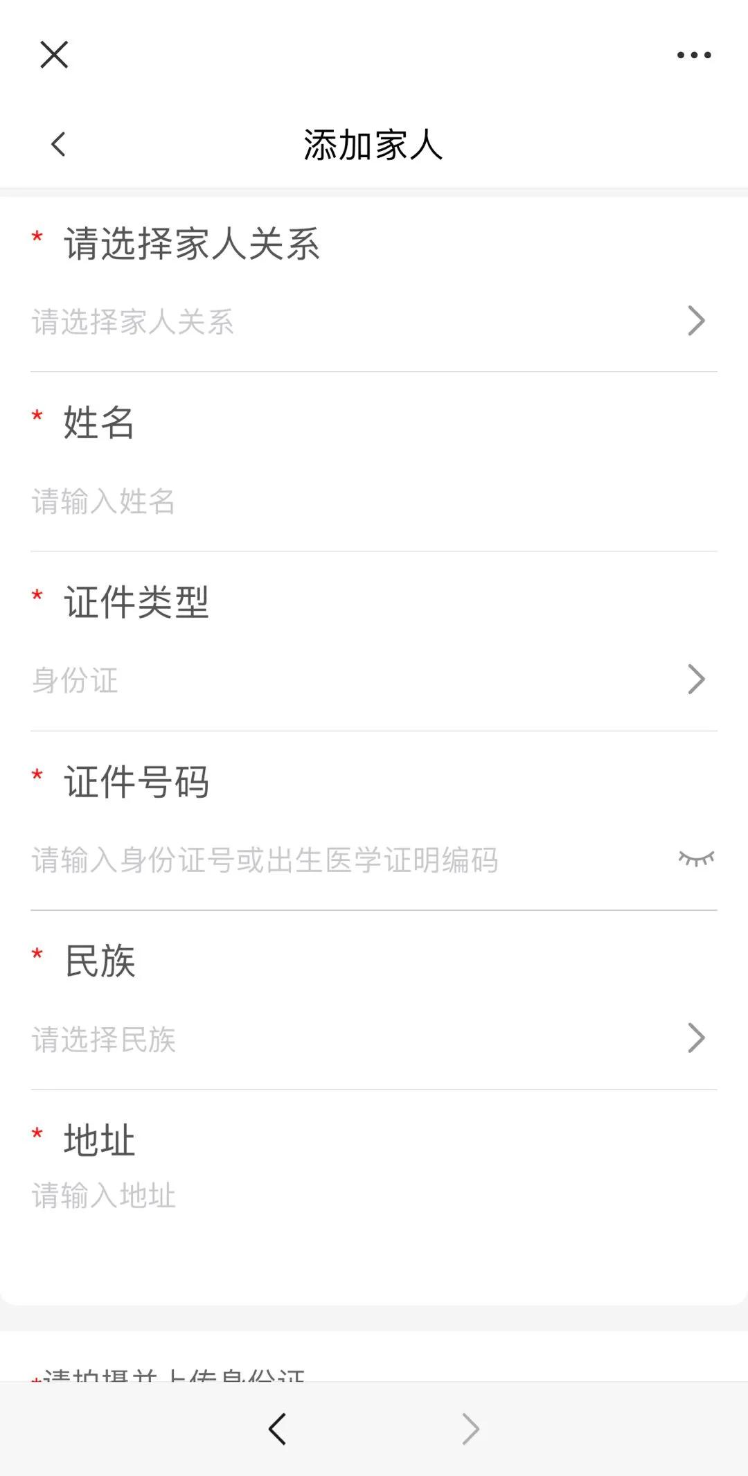 3如实填写家人信息,如家里孩子没有身份证,则“证件类型” 选择“户口本”,上传户口本本人页照片。