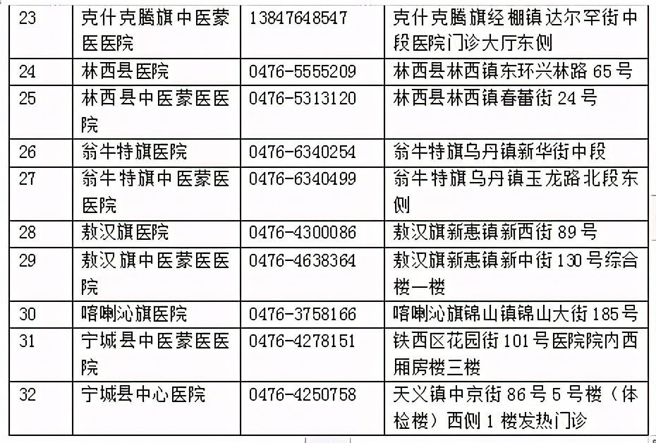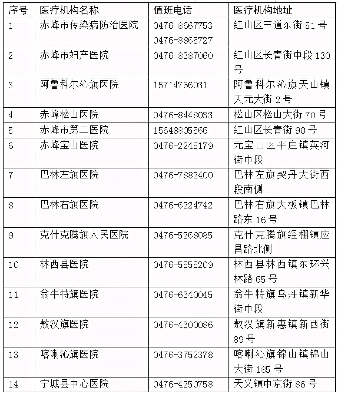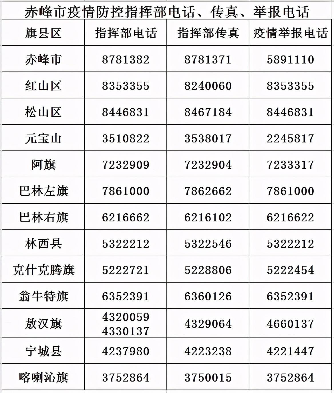 以下《赤峰市核酸检测医疗机构信息》、《赤峰市新冠肺炎定点医疗机构名单》、《赤峰市发热门诊医疗机构名单》和《赤峰市疫情防控指挥部电话、传真、疫情举报电话》请广大市民留存备用,就近选择核酸检测机构,并尽量在检测前进行预约,减少排队等待时间,避免人员聚集。