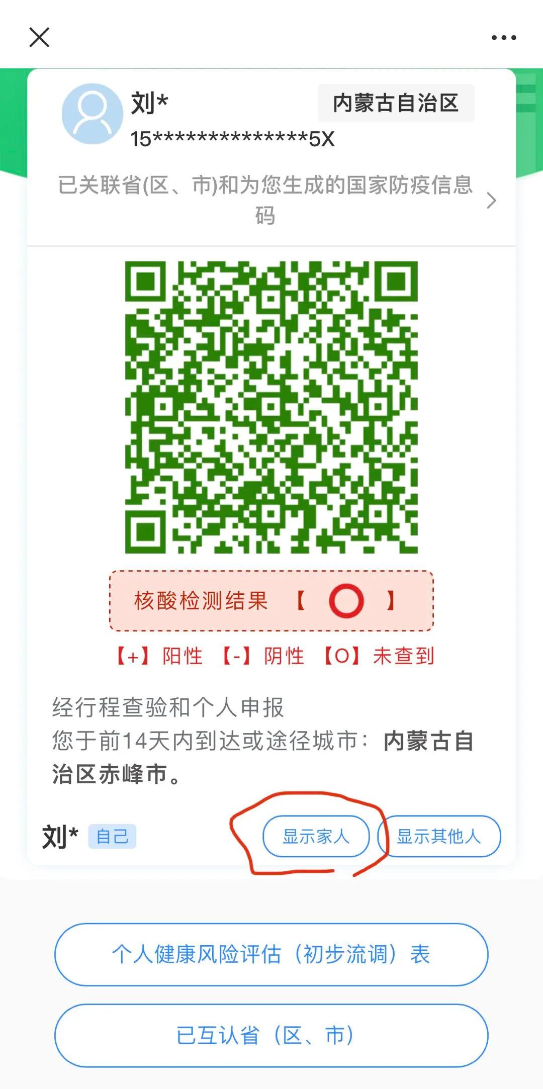 4添加完家人电子健康卡信息后,再次返回公众号,进入自己的健康码,在本人健康码页面选择“显示家人”,然后在列表里选择自己的家人,按系统提示操作,填写家人健康信息后点击提交申请,即可获得家人健康码。