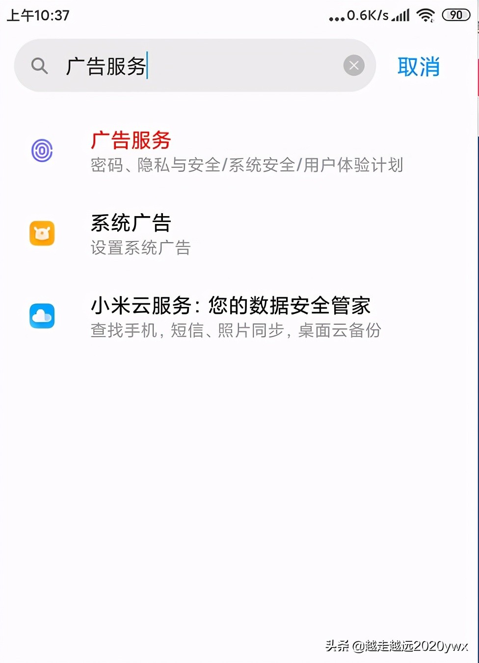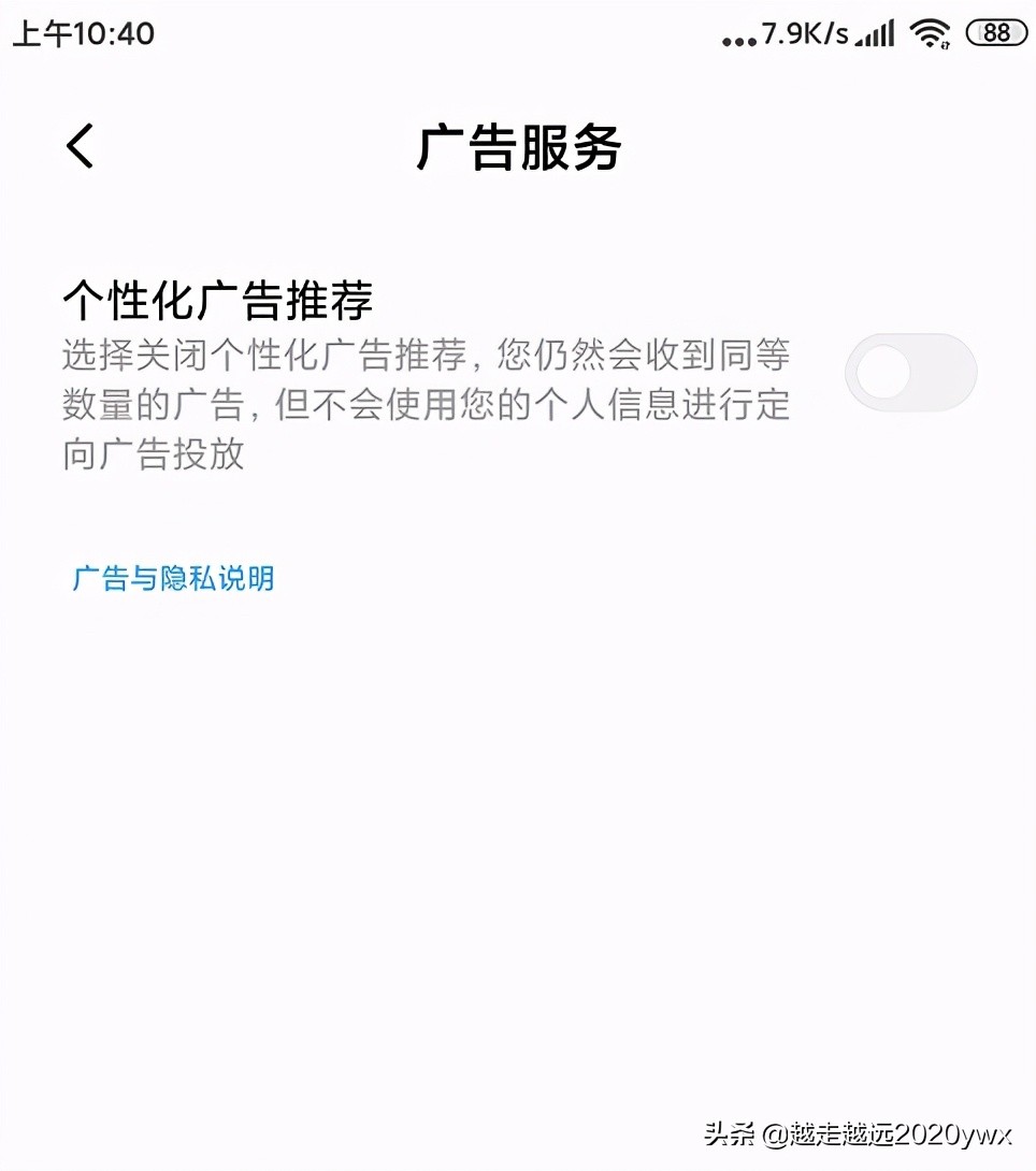 1)打开“设置” ,输入“广告服务” 点击进去关闭“个性化广告推荐”