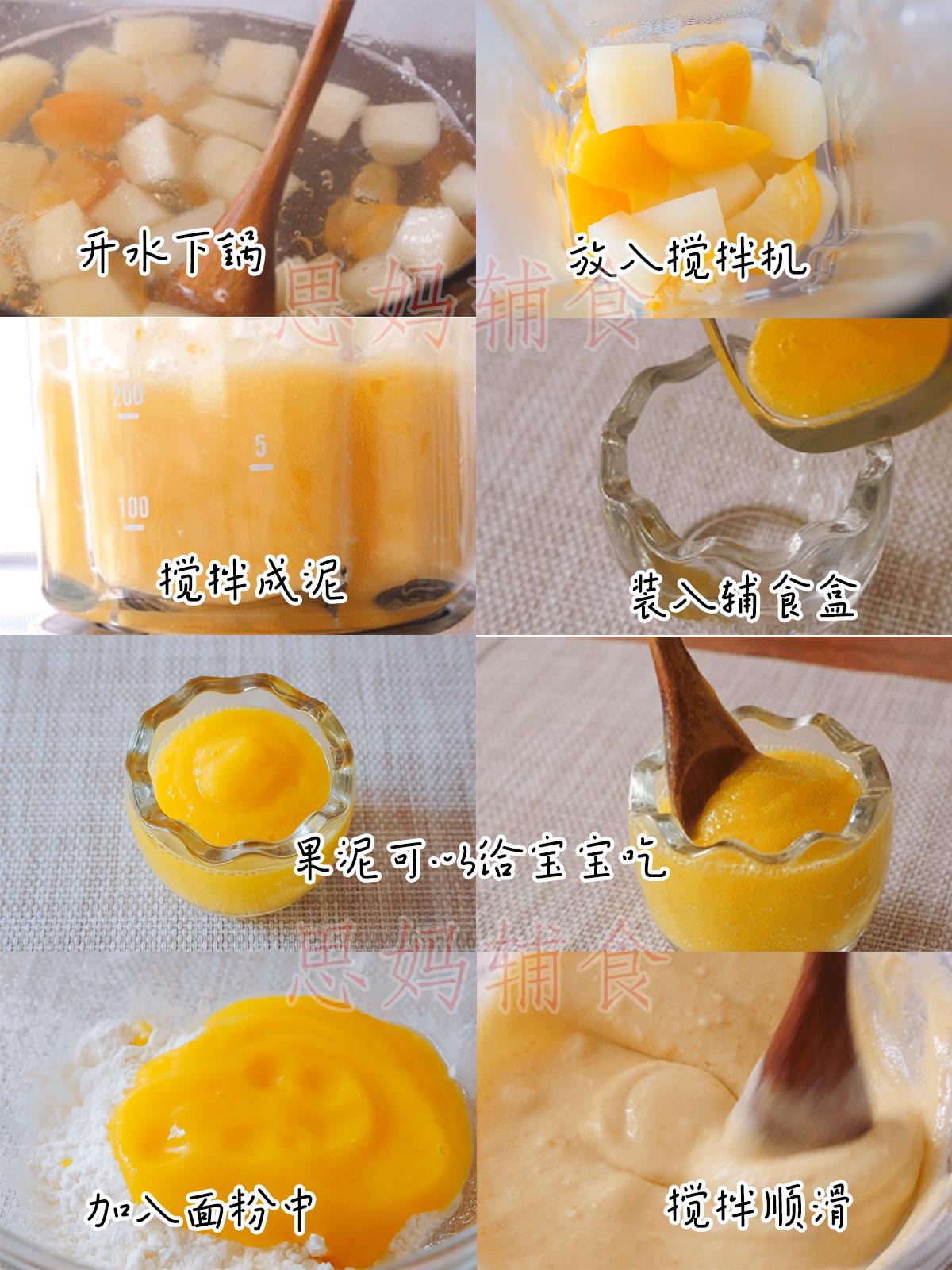 4.捞出剩余果肉,加入30克水果汤,放入搅拌机搅打成果泥后放入辅食盒里(果泥可以加水或者米粉后给宝宝吃,止咳润肺)
