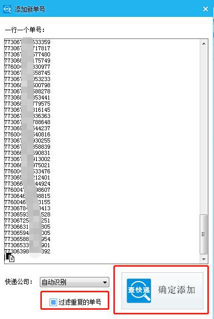 2.将需要查询的快递单号全部复制,然后粘贴到工具即可,点击下方的【过滤重复单号】,避免重复查询,然后点击【确定添加】,快递查询工作就开始啦。