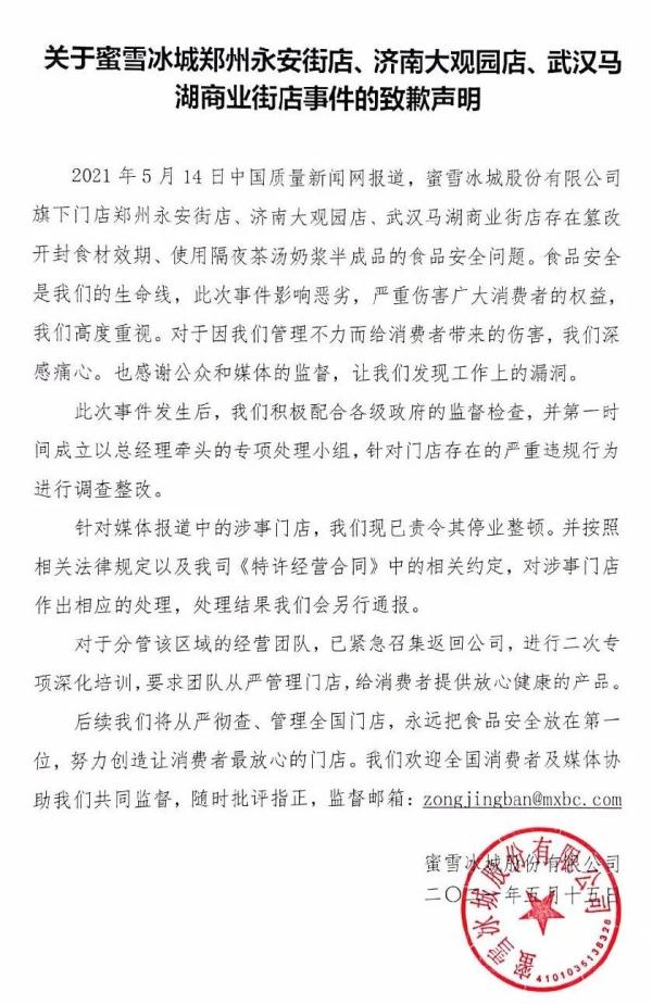 5月15日,蜜雪冰城就食品安全问题致歉,表示针对门店存在的严重违规行为进行调查整改,涉事门店现已责令其停业整顿。