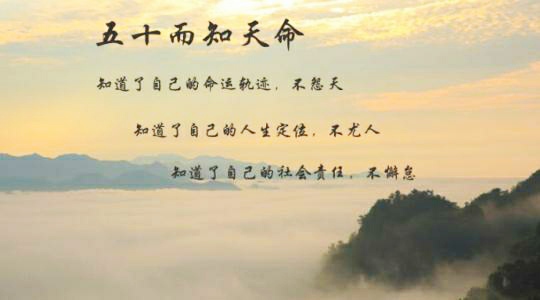 “五十而知天命”的意思是说,人到了50岁时,应该懂得“天意”的道理,和对命运的认知与把握。从年轻时就开始努力拼搏进取,但有时候因为主客观上的时、命、运的诸多因素的干扰,阴错阳差,颠三倒四,也许并不能取得人生的成功,更谈不上满意。那么,人到了50岁,什么事基本上都能够想明白了,所以既然知道了自己的命运轨迹,就不去怨老天,知道了自己的人生定位,也不去怨别人,知道了自己的肩头责任,更不能懈怠。因此,50天命之年,就应该有“5知”,即“上天”的意志、自然的法则、命运的安排、固有的天赋、天然的寿命。