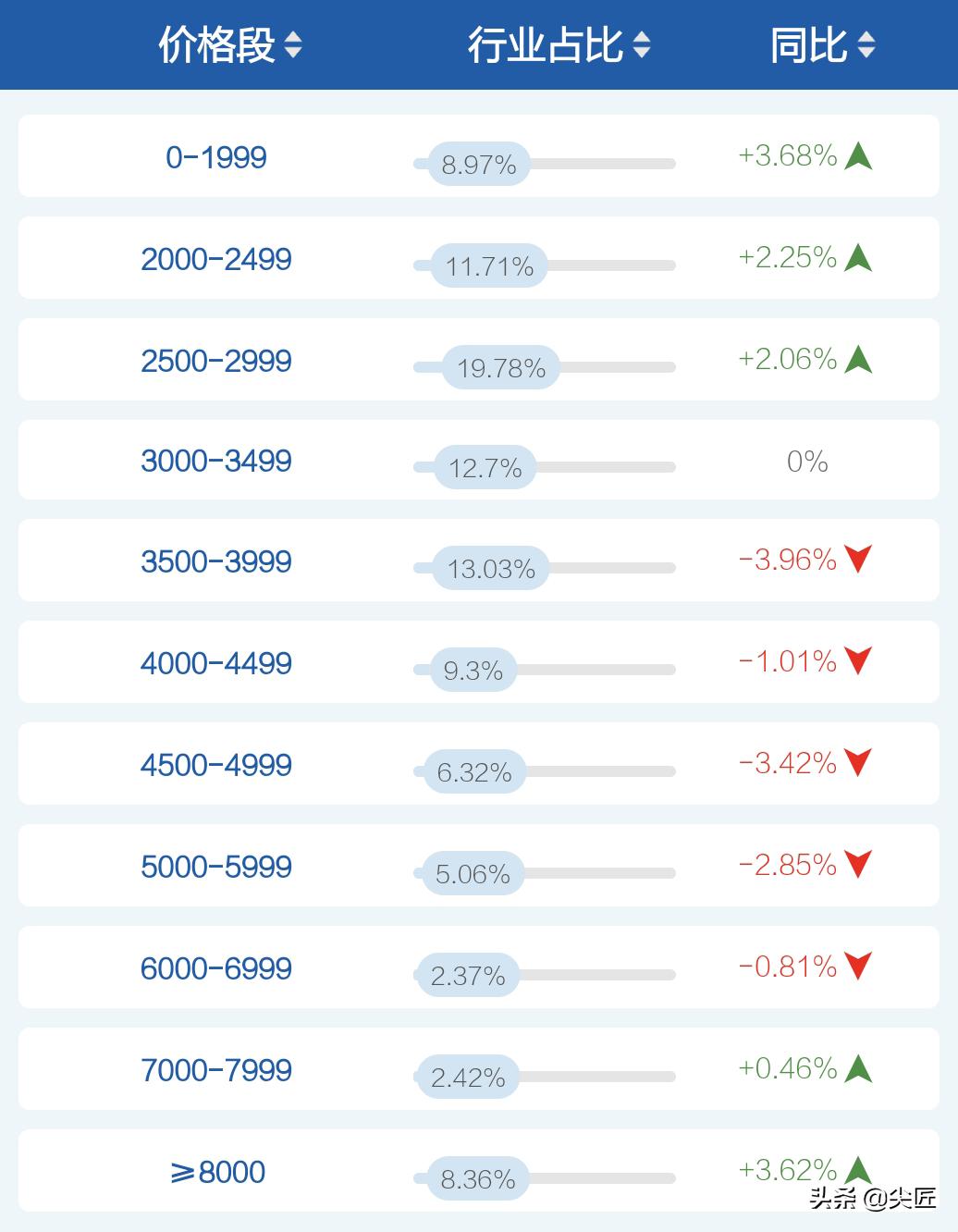 从价格区间看,3000元以下的中低端产品销量继续扩大,市场销售额份额已超过40%,其中2500-2999元价格段销售额最大,占据19.78%的份额,而7000元以上高端产品销售势头良好,市场份额逐渐扩大。