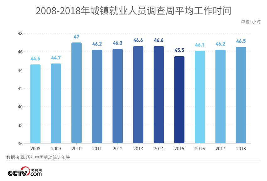 中国劳动统计年鉴数据显示,近十年来,城镇就业人员每周平均工作时间的最高值出现在2010年,达到47个小时,超出标准工时7个小时,距离增加一个工作日仅差1小时。2011年和2015年平均工作时间分别出现过两次回落,但此后均呈现逐年上涨态势。