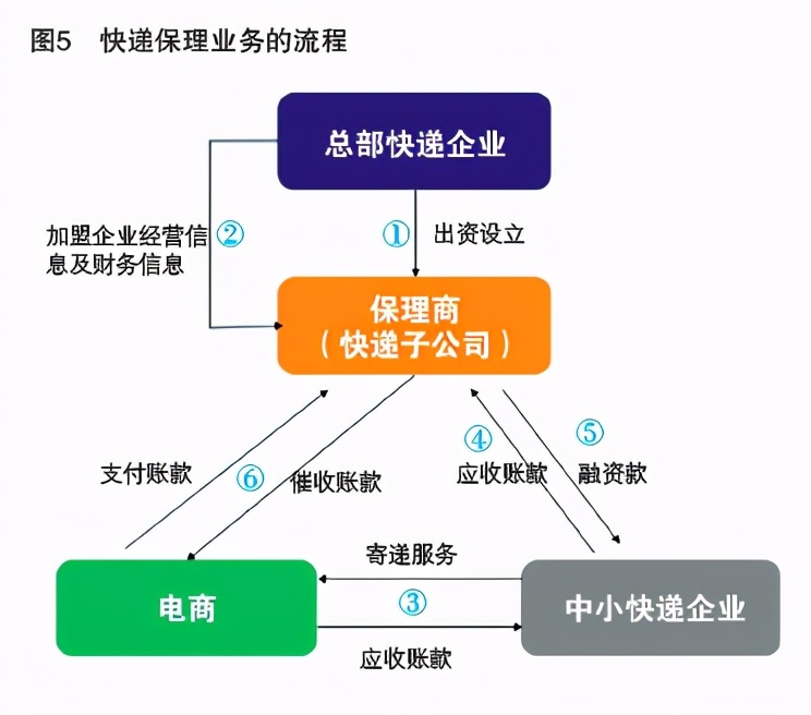 快递保理业务交易结构( 见图5)如下:1.总部快递企业成立一家子公司作为保理商。2.总部快递企业将旗下中小快递企业的KPI考核数据共享给保理商,保理商掌握中小快递企业的业务经营数据、财务数据及车辆运行、申诉率等信息数据。3.中小快递企业为电商提供寄递服务,产生应付账款。4.快递保理商与中小快递企业签订保理协议,将应收账款向保理商申请保理融资。5.保理商根据中小快递企业的业务经营数据、财务数据及车辆运行、申诉率等信息数据并结合资信评估模型为中小快递企业进行资信评估,授予信用额度并核算融资费率,从而为中小快递企业提供保理融资服务。6.保理商凭借应收账款向电商催收账款。