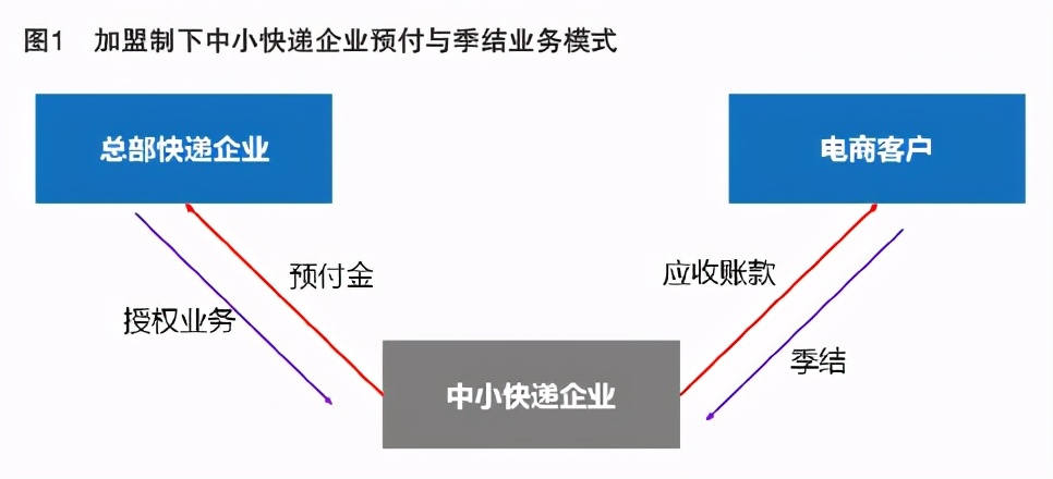 据统计,中小企业超过70%的资产为应收账款和库存(张晓健,2012),由于无法快速变现严重影响其现金流稳定性,中小快递企业作为中小企业也面临同样的困境。快递行业的业务模式是造成中小快递企业资金匮乏的最主要原因。加盟制模式下,中小快递企业一方面要向总部快递企业支付预付款,另一方面在业务经营中又存在大量应收账款(见图1)。目前除了个别品牌快递企业采用直营模式外,其他品牌快递企业均为加盟制。加盟制最为明显的特征是总部快递企业与中小快递企业是松散的关系,分别属于独立的法人机构。总部快递企业为了有效管控中小快递企业,通常与中小快递企业签订预付制协议,实行预付制业务模式。根据企业年报的单票收入2.2元左右计算,每天中小快递企业的业务量大约为2亿票,每月资金占用总余额达到132亿元。