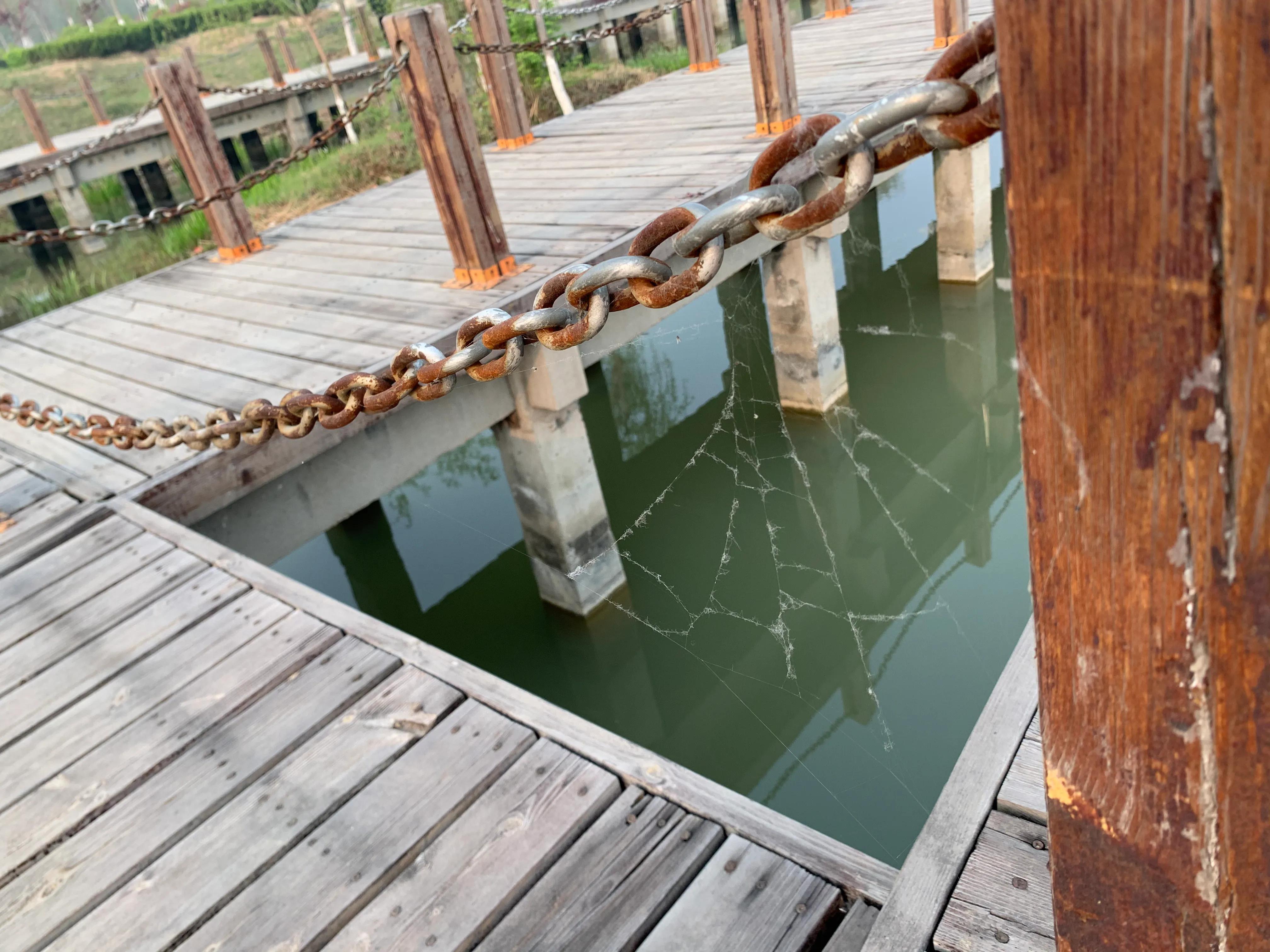 去木栈道上走一圈,木头踏上去弹性十足,舒服得很,一个破旧的蜘蛛网,蛛去网空,估计今年再织一个新家。