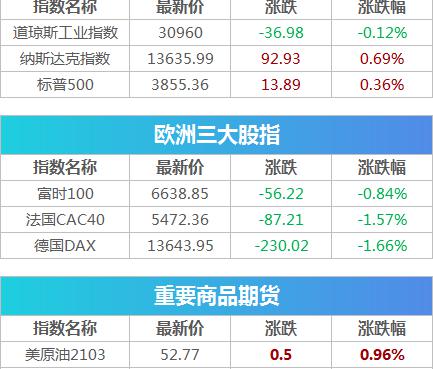 截至收盘,道指跌36.98点,跌幅0.12%,报30960.00点,纳指涨0.69%,报13635.99点,标普500指数涨0.36%,报3855.36点。
