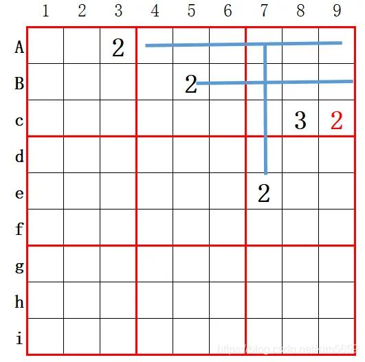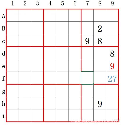 假设f9已确定只可填2或7,7列8列已已经有9,则e9只可填9。