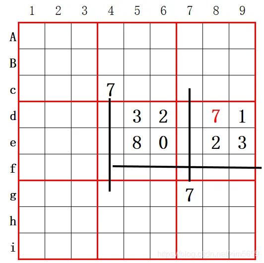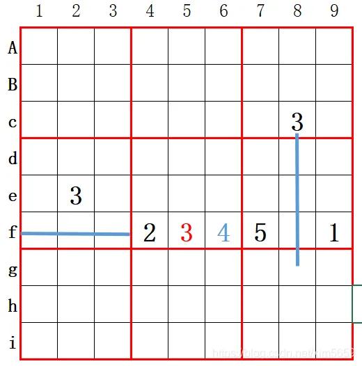 说明:2宫的7决定5宫4列不会有7,而5宫f列必然有7,则6宫f列不会有7,而g7的7决定了7列不会有7,则6宫只有一个位置要填7。