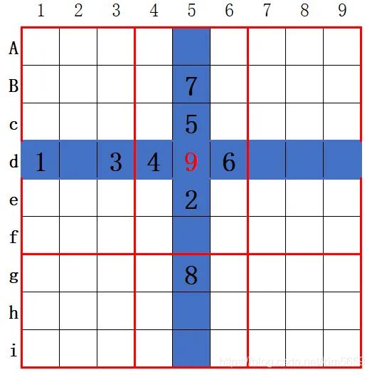 9宫格数独分为行、列、宫(如下图):