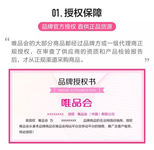 值得注意的是,“100%正品”和品牌授权是唯品会平台宣传的亮点,平台称商品均经过多重质检,有专业鉴定和中国人保承保,品牌官方授权更是放在宣传的第一位。