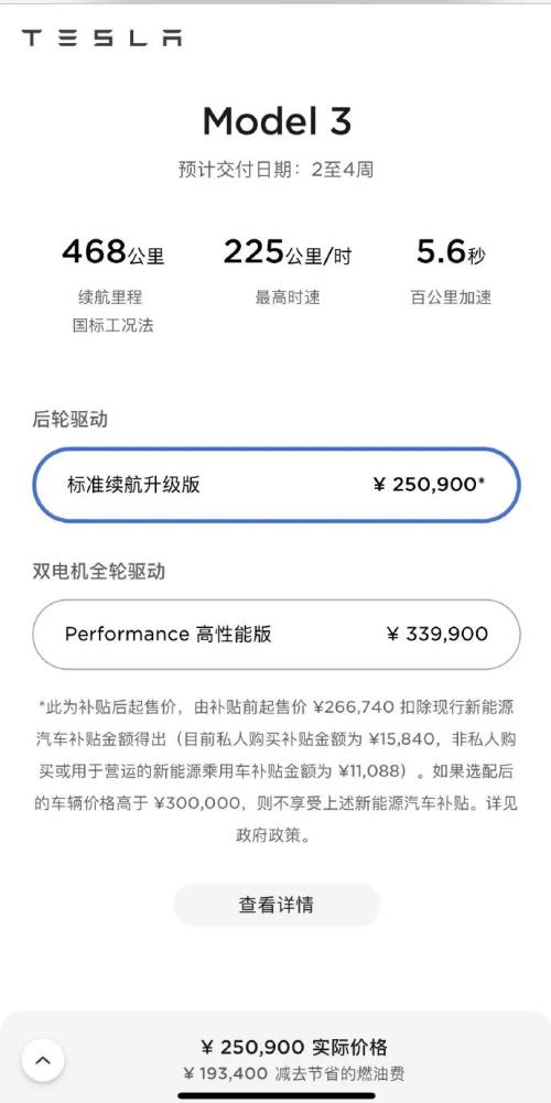 上调之前,标准续航升级版Model 3在国内市场补贴之前的起售价为265740元,上调之后为266740元。扣除15840元的补贴之后,私人购买的起售价为250900元;非私人购买的补贴为11088元,起售价为255652元。