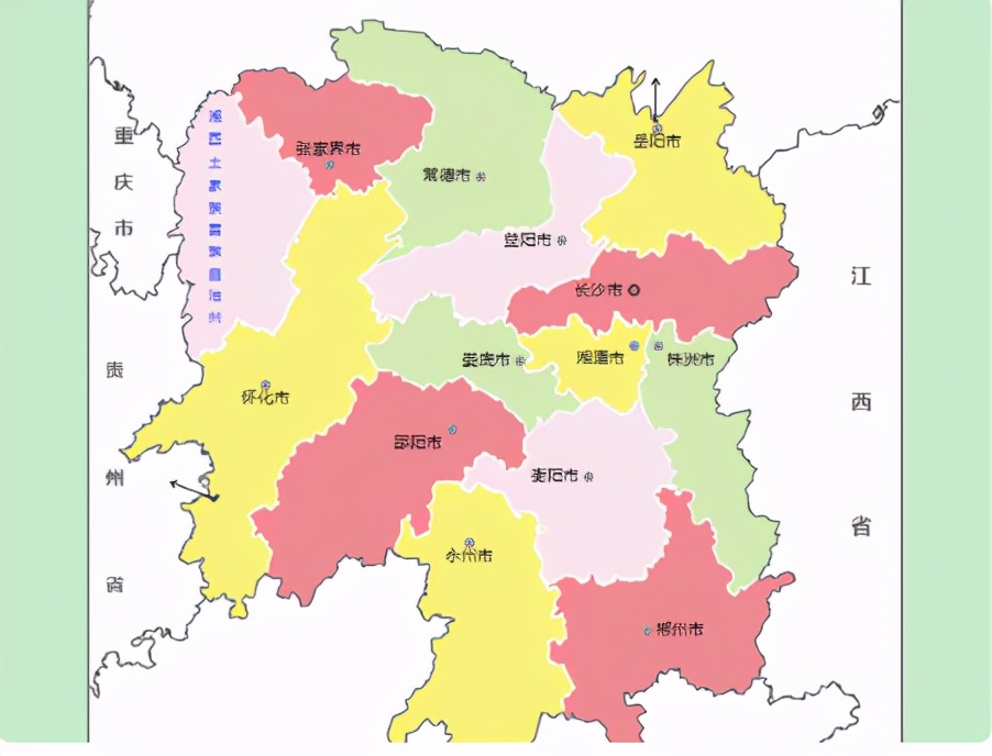 湖南省地理位置:湖南省地处长江中游,省内大部分地区位于洞庭湖以南,故称湖南;湘江贯穿省内南北,故称湖南。它位于108°47’-114°15’E,24°38’-30°08’N,与江西毗邻的East阜阜和武功山、贵州云南西部的贵州高原、重庆西北部的武陵山脉。