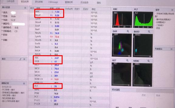 患者,52岁,女性,因月经不规则等就诊于我院更年期门诊。血液常规检验结果:白细胞1.54×109/L「正常女性参考区间(3.5~9.5)×109/L」,且以中性粒细胞绝对值降低为主。同时伴有红细胞减少(2.67×1012/L)、血小板下降(78×109/L)(图1)。