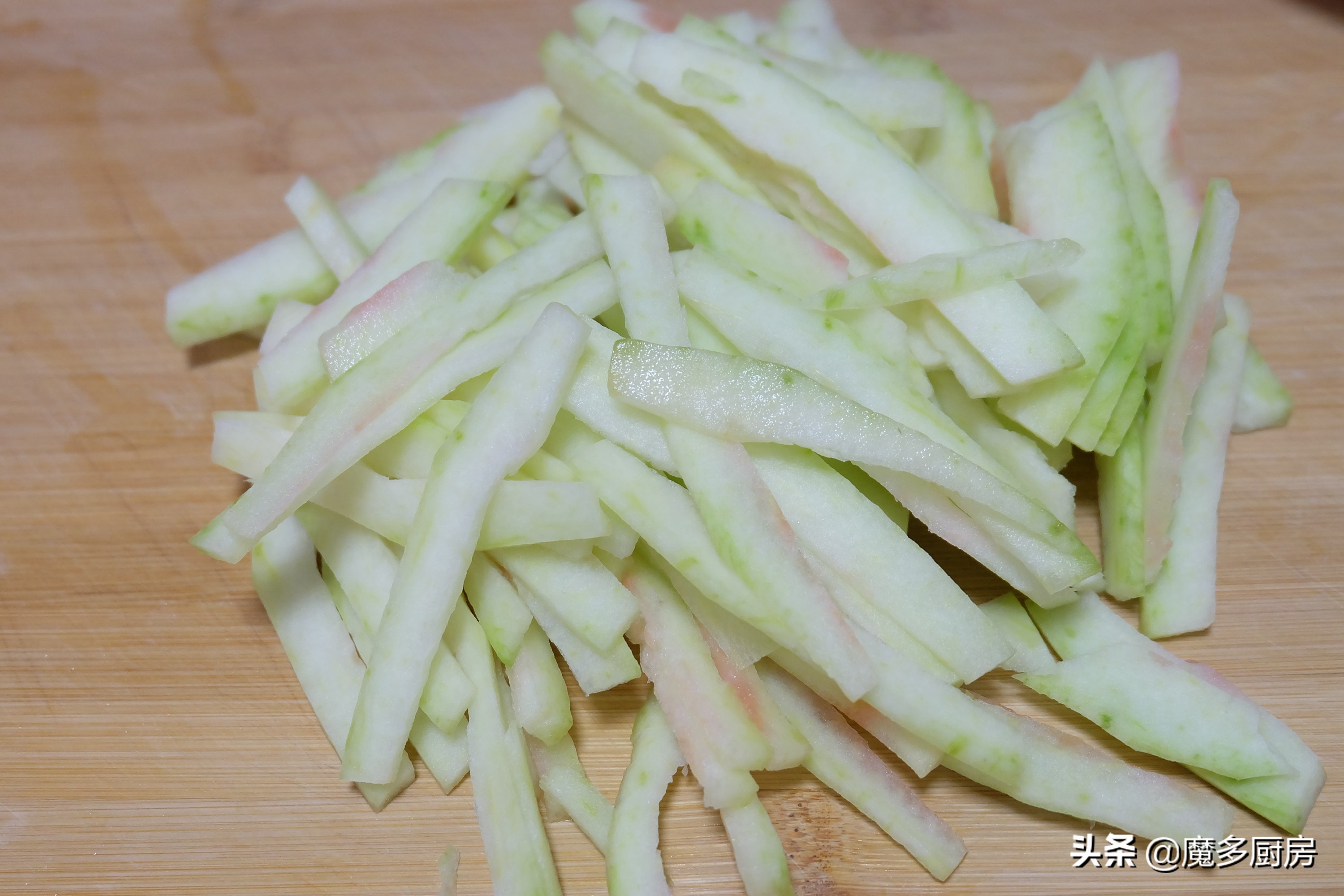 2、将处理好的西瓜皮切成薄片;