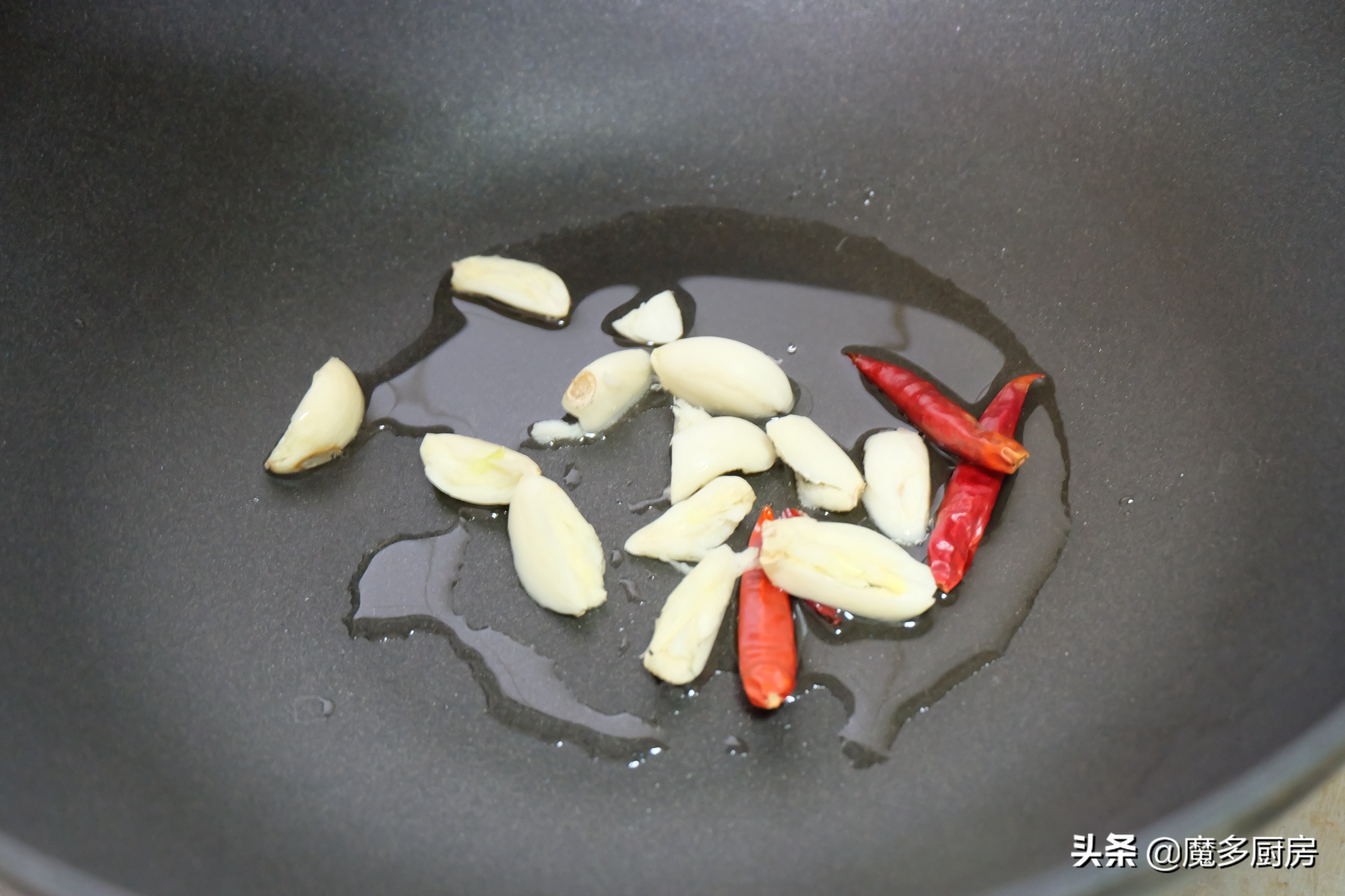 4、炒锅上火烧热,放食用油,放干红辣椒和大蒜炸出香味;
