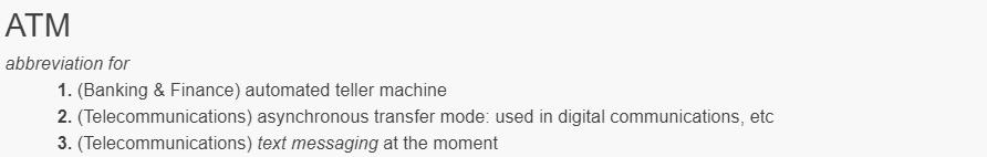 tell 是告诉,但 teller 不能译为说话的人,而是银行出纳员。自动取款机就像一个不会说话的柜员 ,所以是 Automatic Teller Machine.