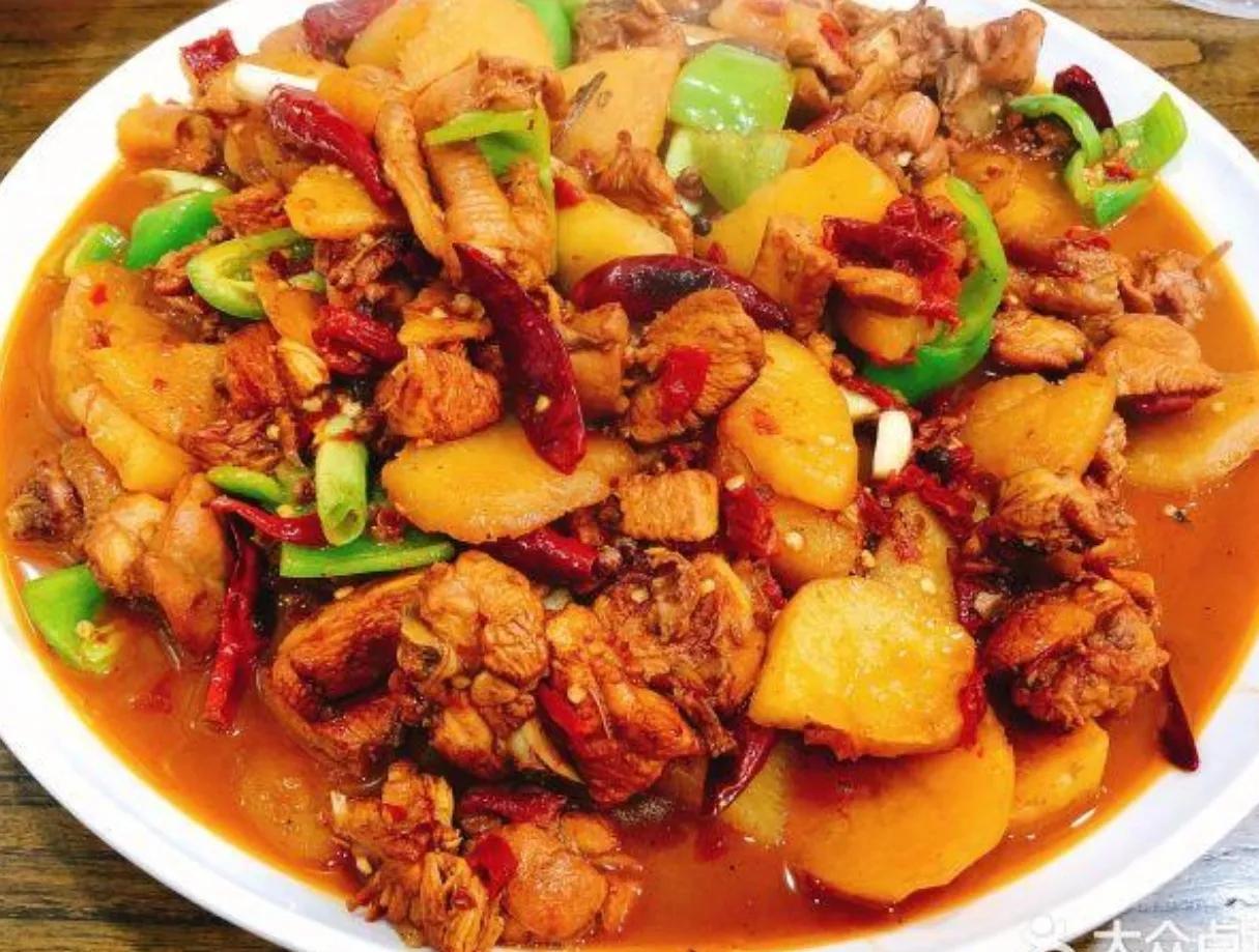 4.锅滑光添油150克,下白糖用勺搅动慢慢融化(糖色),大炮回落时下花椒,快速下鸡块翻炒均匀,下老抽,盐,葱姜蒜,香料,板椒酱,翻炒均匀,再下朝天椒,炒出香味,(多炒一会,颜色发亮)加入土豆块炒约一分钟,加水3勺,大火烧开,小火15分钟左右,加入葱姜蒜和青红椒,香醋5克,炒约1分钟倒入装有熟面片的大盘中即成。