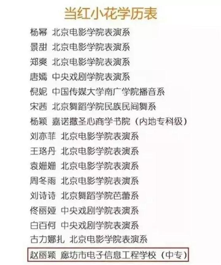 一份当红小花学历表显示,绝大部分都是中央戏剧学院、北京电影学院毕业的高材生,只有赵丽颖是与表演毫无关系的中专毕业,但论到艺术成就,她却丝毫不逊于其中每一个人。