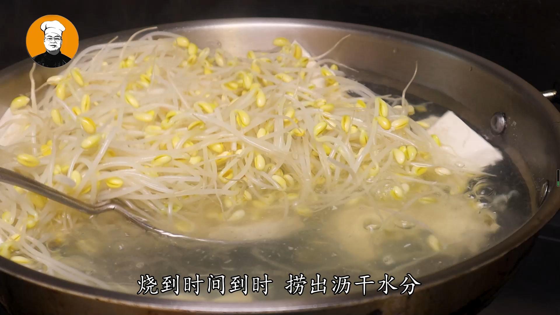 6、再把老豆腐和黄豆芽放入开水中焯水,锅开后煮两分钟就可以捞出沥干水分,放入盆中备用。黑鱼腌制时间到时,把腌制的辅料丢弃不用。烤盘中放入老豆腐和豆芽垫底