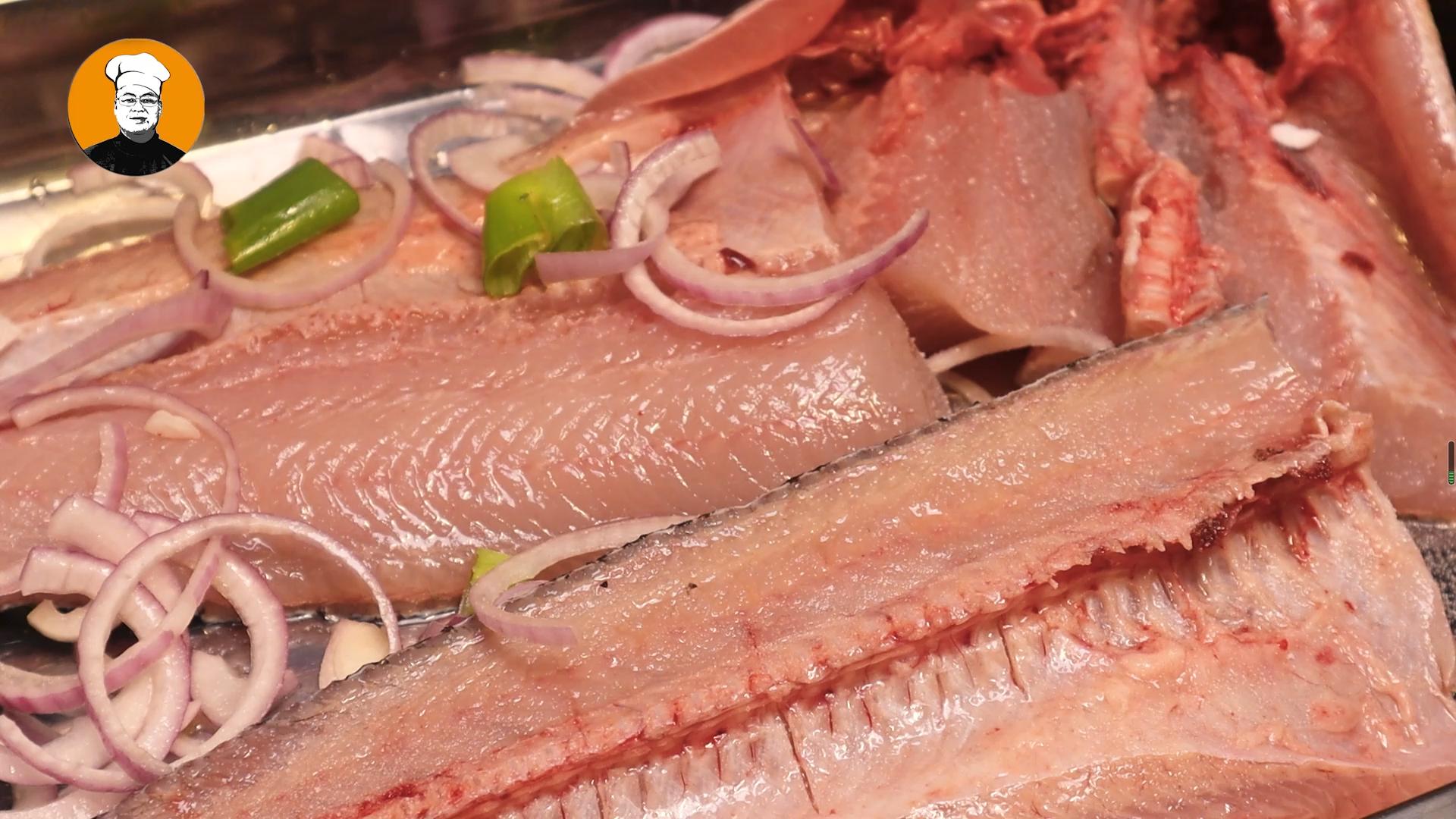 4、先把洋葱切洋葱丝,抖散放入盘中备用,一根大葱切段,生姜切片,蒜子同样切片。四斤重的黑鱼叫老板把中脊骨撇开来了,里面的血都清洗干净了。先在鱼身上打上花刀,腌制时更入味,再从一半的位置切成两段,油炸的更方便
