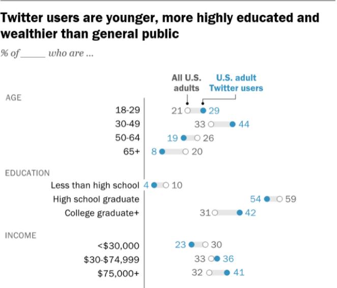 根据皮尤研究中心的调查数据,与美国普通公众和其他主流社交网站用户相比,美国的Twitter用户呈现出更为年轻、收入更高、受过高等教育比例更高的特点;可以说Twitter从某种程度上代表了中产及以上阶级的网络社交取向,同样也对这些阶层具有更高的影响力。
