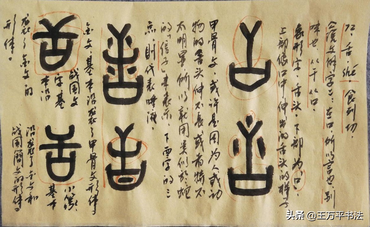 甲骨文,或许是因为人和动物的舌头伸不长,或者特征不太明显,所以就用类似于蛇的“信子”来表示。下面字的三点则代表唾液。