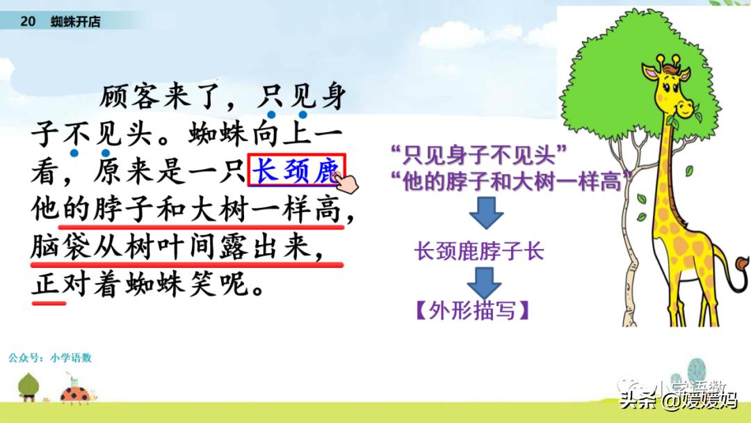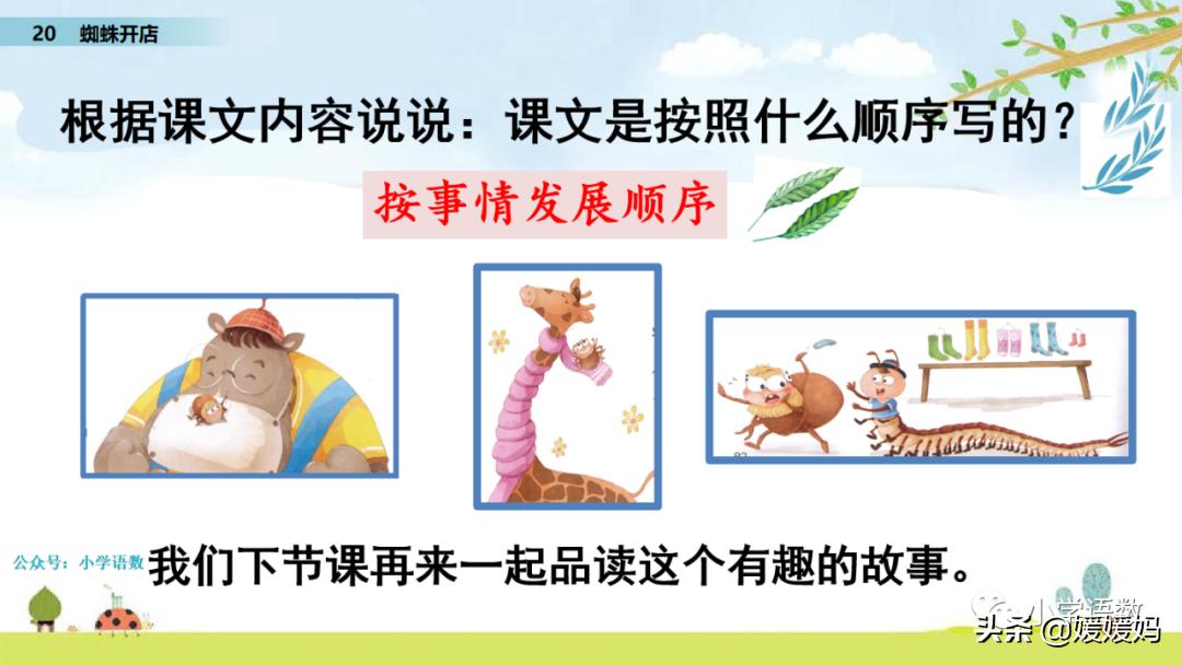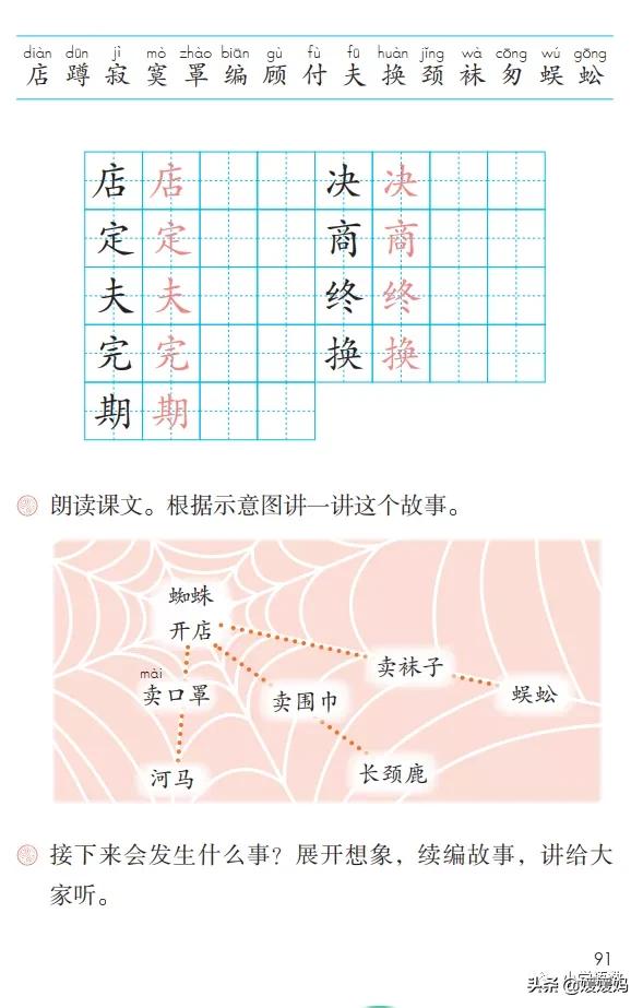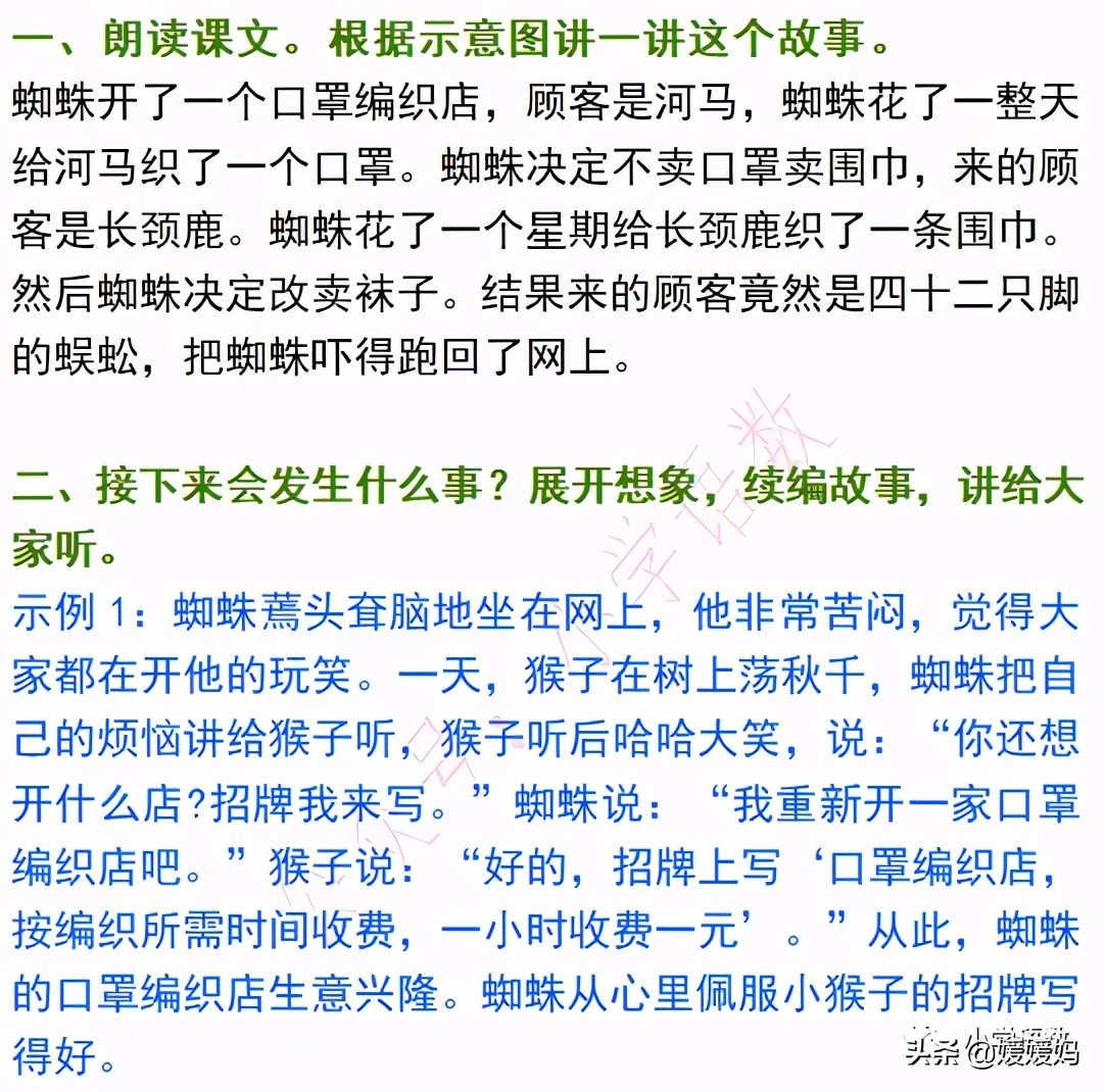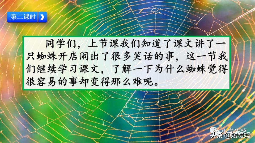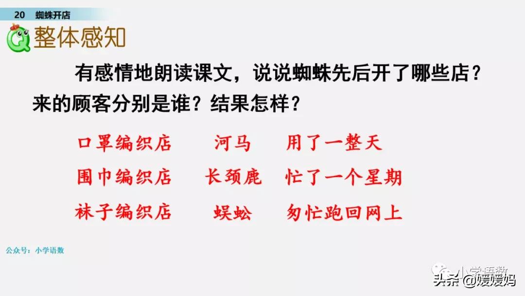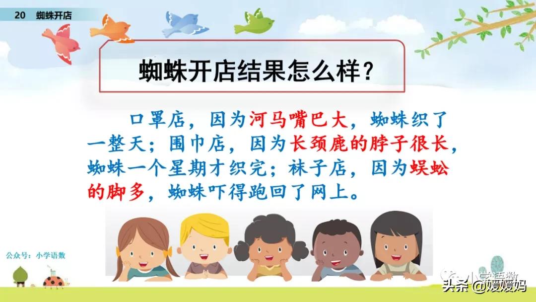 蜘蛛开口罩编织店来了河马,蜘蛛用了一整天才织完口罩;蜘蛛开围巾编织店来了长颈鹿, 蜘蛛忙了一个星期才织好围巾;蜘蛛开袜子编织店来了蜈蚣,蜘蛛吓得跑回了网上。