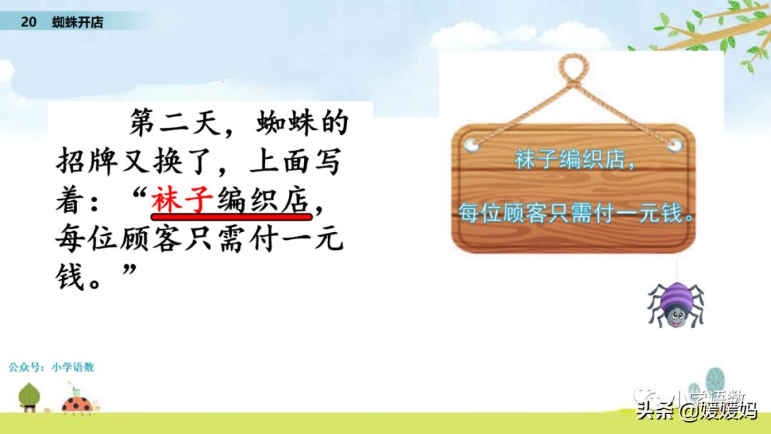 “口罩编织店,每位顾客只需付一元钱。”“围巾编织店,每位顾客只需付一元钱。”“袜子编织店,每位顾客只需付一元钱。” 蜘蛛的头脑太简单了,招牌不能这样写。卖口罩应该按大小计价,卖围巾按长短计价,卖袜子应该按多少只计价,不能一律一元钱。