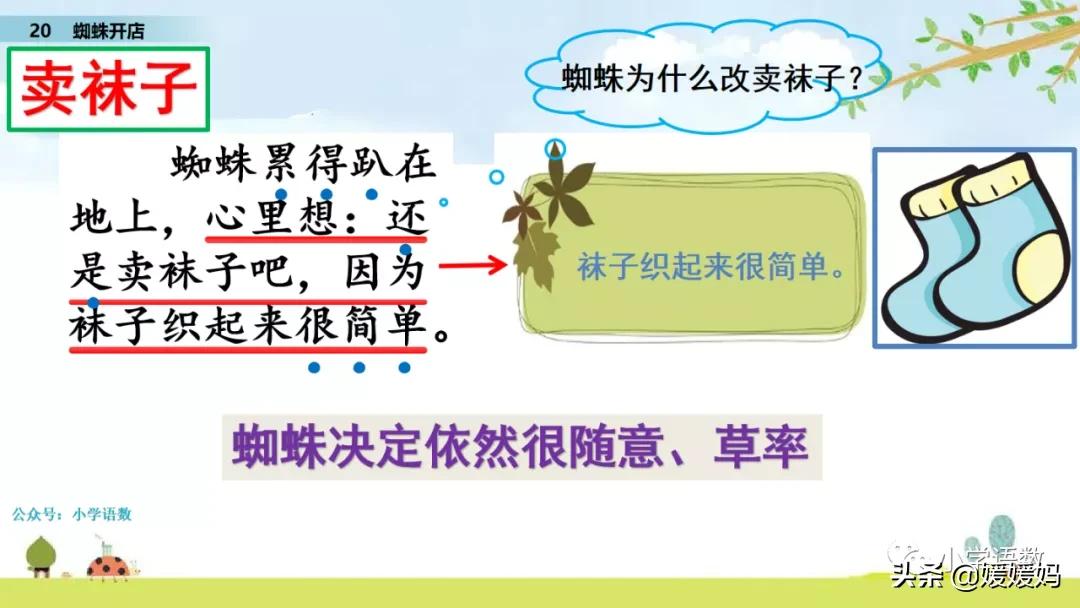 文中3 处直接描写了蜘蛛的想法:卖什么呢?就卖口罩吧, 因为口罩织起来很简单。晚上, 蜘蛛想:还是卖围巾吧,因为围巾织起来很简单。蜘蛛累得趴倒在地上,心里想:还是卖袜子吧,因为袜子织起来很简单。从以上蜘蛛的想法中,我们看到都有“很简单”这个词,可见蜘蛛根本没有认真考虑过“卖什么”,什么简单他就织什么。