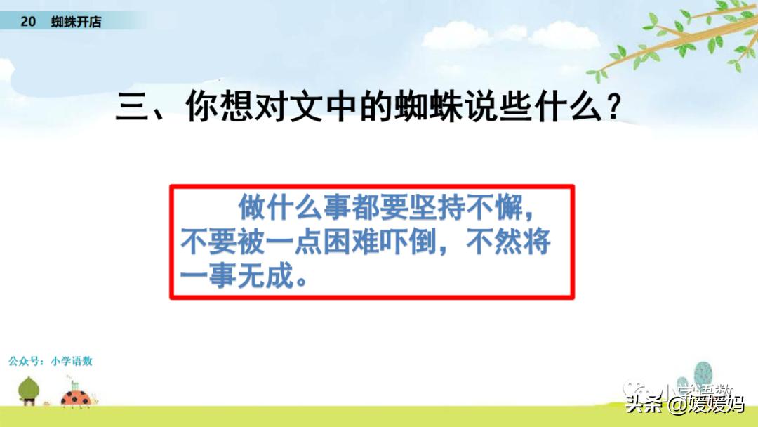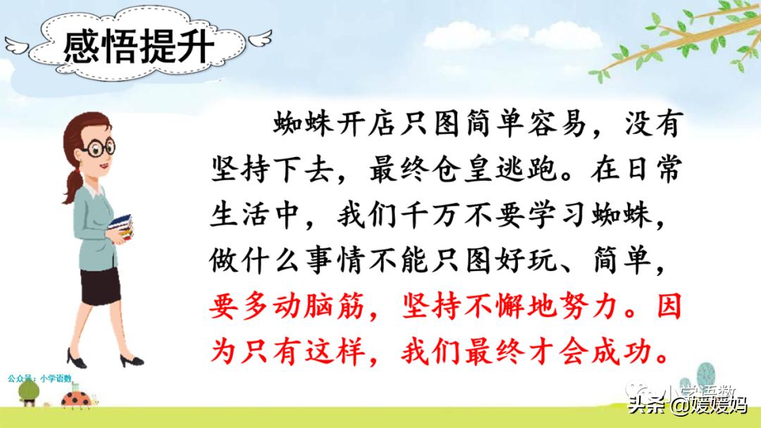 《蜘蛛开店》是一篇童话故事。这个故事讲的是蜘蛛想开店,先后开了卖口罩、卖围巾的店,当开卖袜子的店时,碰到了蜈蚣,最后放弃的故事,告诉我们做事要有始有终,不能半途而废。