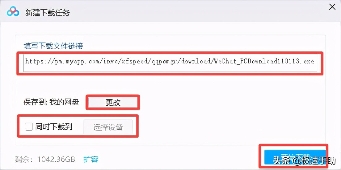 第三步,然后软件会弹出【新建下载任务】的窗口,在此窗口的【填写下载文件链接】一栏中,输入需要下载的资源的链接,然后如果需要更改保存的位置,就点击【修改】按钮,不需要修改的话,直接点击【开始下载】按钮。同时,你还可以勾选是不是要同时下载到其他设备上。
