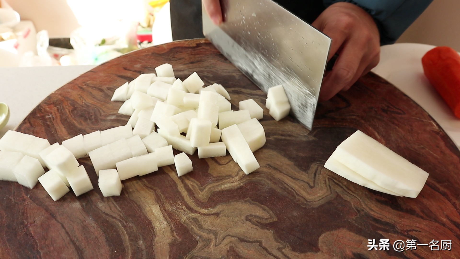 2.白萝卜半根,同样切成长条和小方丁,和莴笋放在一起。