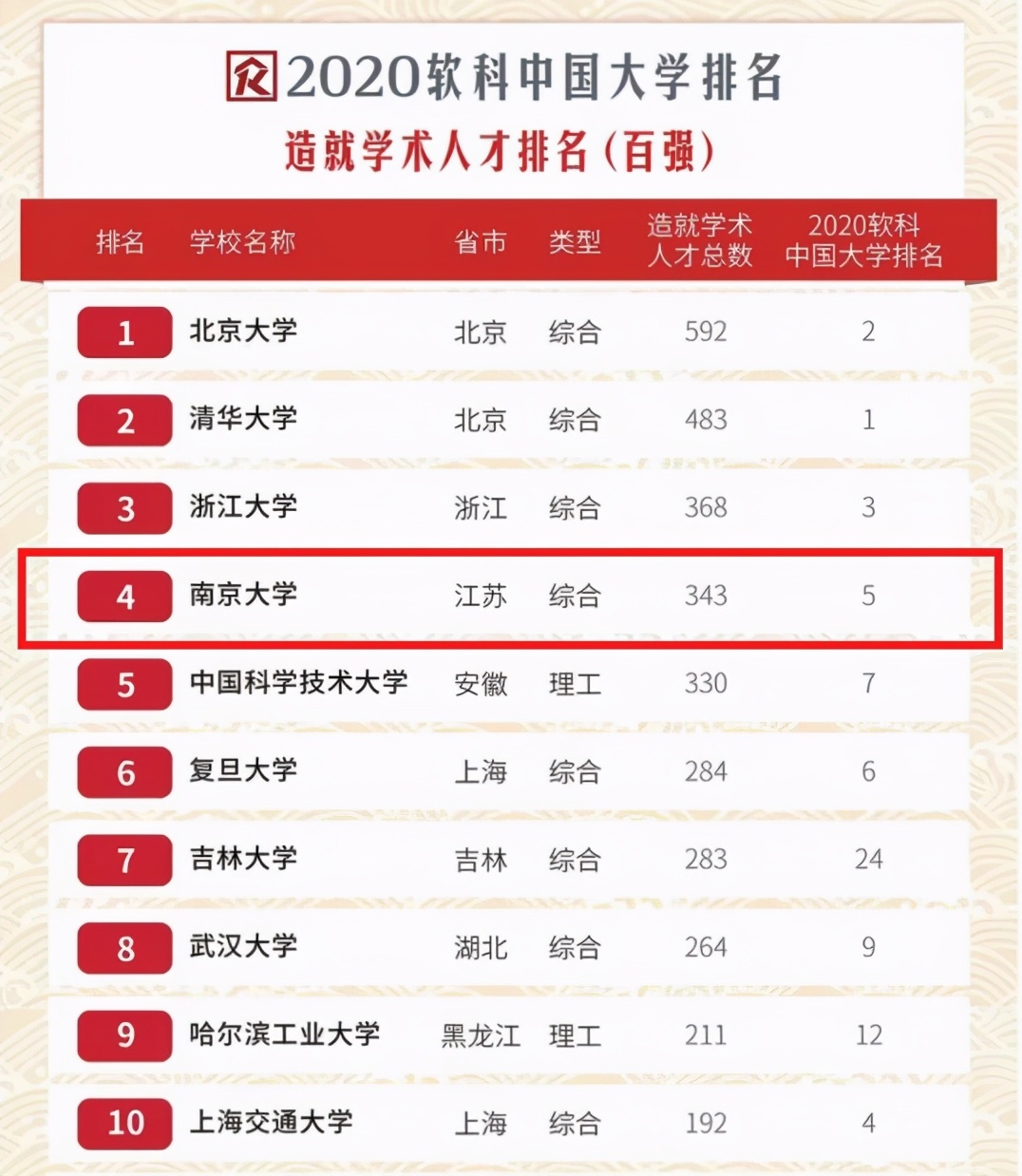 根据软科发布了&34;2020软科中国大学排名造就学术人才排名(百强)&34;榜单,南京大学以培养343名学术人才的成绩位居总榜第4,充分彰显出了学校在学术人才培养方面的实力。
