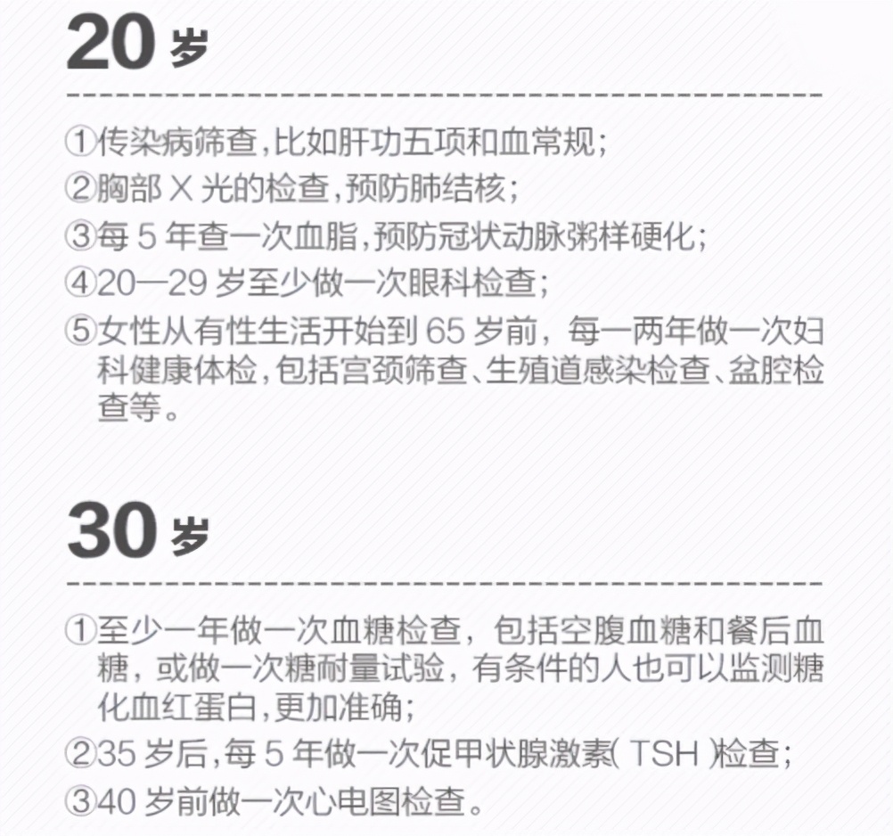 20岁开始,就要开始定期体检了。这个年龄阶段的人生活往往不规律、性生活较频繁,容易感染各类传染病。