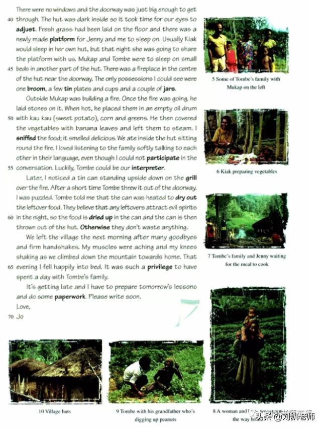 You asked whether I&39;m getting to know any local people. 你问我是否了解当地的老百姓。Well, that&39;s actually quite difficult as I don&39;t speak much of the local English dialect yet. 这实在是太难了,因为我还说不了几句当地人说的英语。But last weekend another teacher, Jenny, and 1 did visit a village which is the home of one of the boys,Tombe. 不过,上周末我和另外一位叫詹妮的教师真的去访问了一个村庄,那是我的学生汤贝的家。 It was my first visit to a remote village.这是我第一次到偏僻的村子里去。We walked for two and a half hours to get there -first up a mountain to a ridge from where we had fantastic views and then down a steep path to the valley below. 我们步行了两个半小时才到达那里——先是爬山,爬到山脊能看到奇妙的景色,然后下一个陡坡,一直走到下面的山谷。When we arrived at the village, Tombe&39;s mother, Kiak, who had been pulling weeds in her garden,started crying &34;ieee ieee&34;.当我们到村庄的时候,汤贝的母亲齐亚克本来在园子里拔草,看到我们就“嗳矣,嗳矣”地叫了起来。We shook hands with all the villagers. 我们同所有的村民都握了手。Everyone seemed to be a relative of Tombe&39;s.每个人看上去都是汤贝家的亲戚。