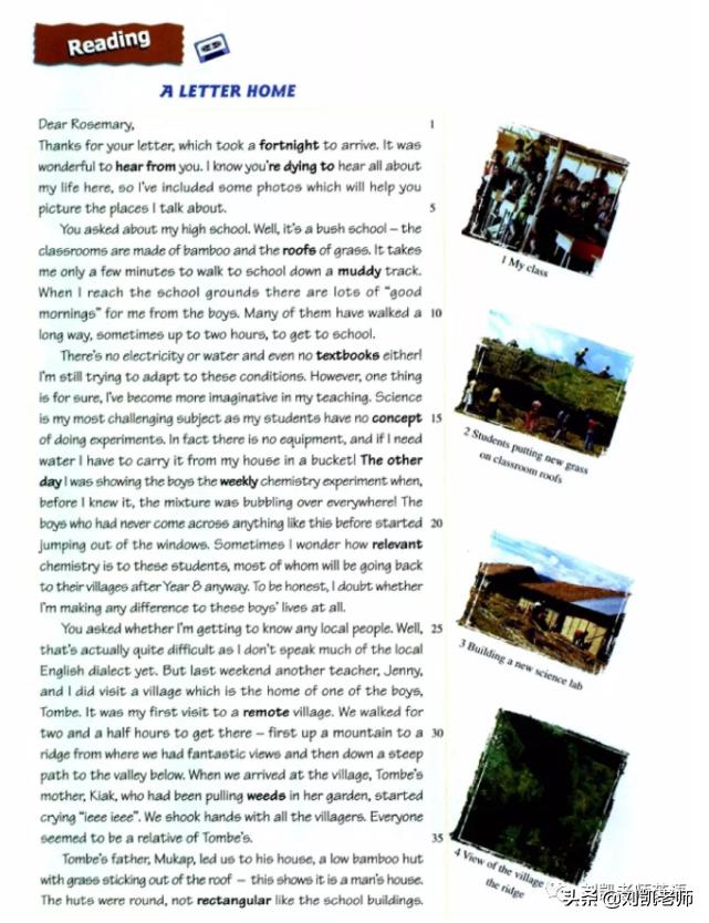 You asked about my high school. 你问起我的中学情况。Well, it&39;s a bush school – the classrooms are made of bamboo and the roofs of grass. 噢,它是一所丛林学校——教室是用竹子搭起来的,屋顶是用茅草盖的。 It takes me only a few minutes to walk to school down a muddy track. 我只要沿着一条泥泞的小路步行几分钟就到学校了。When I reach the school grounds there are lots of &34;good mornings&34; for me from the boys. 每当我走到学校操场的时候,迎接我的是男孩子们一片“早上好”的声音。Many of them have walked along way, sometimes up to two hours, to get to school.他们中许多人走了很长的路,有时候要走两个小时才能到学校。