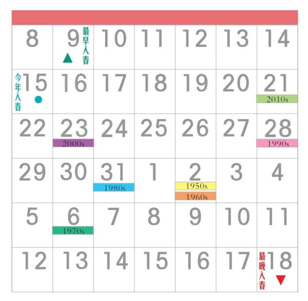 在上个世纪,50年代和60年代,北京4月2日入春;70年代,北京4月6日入春;80年代和90年代,入春日期迈入3月,分别是3月31日和3月28日。进入21世纪,00年代和10年代入春日期再度提前到3月23日和3月21日。