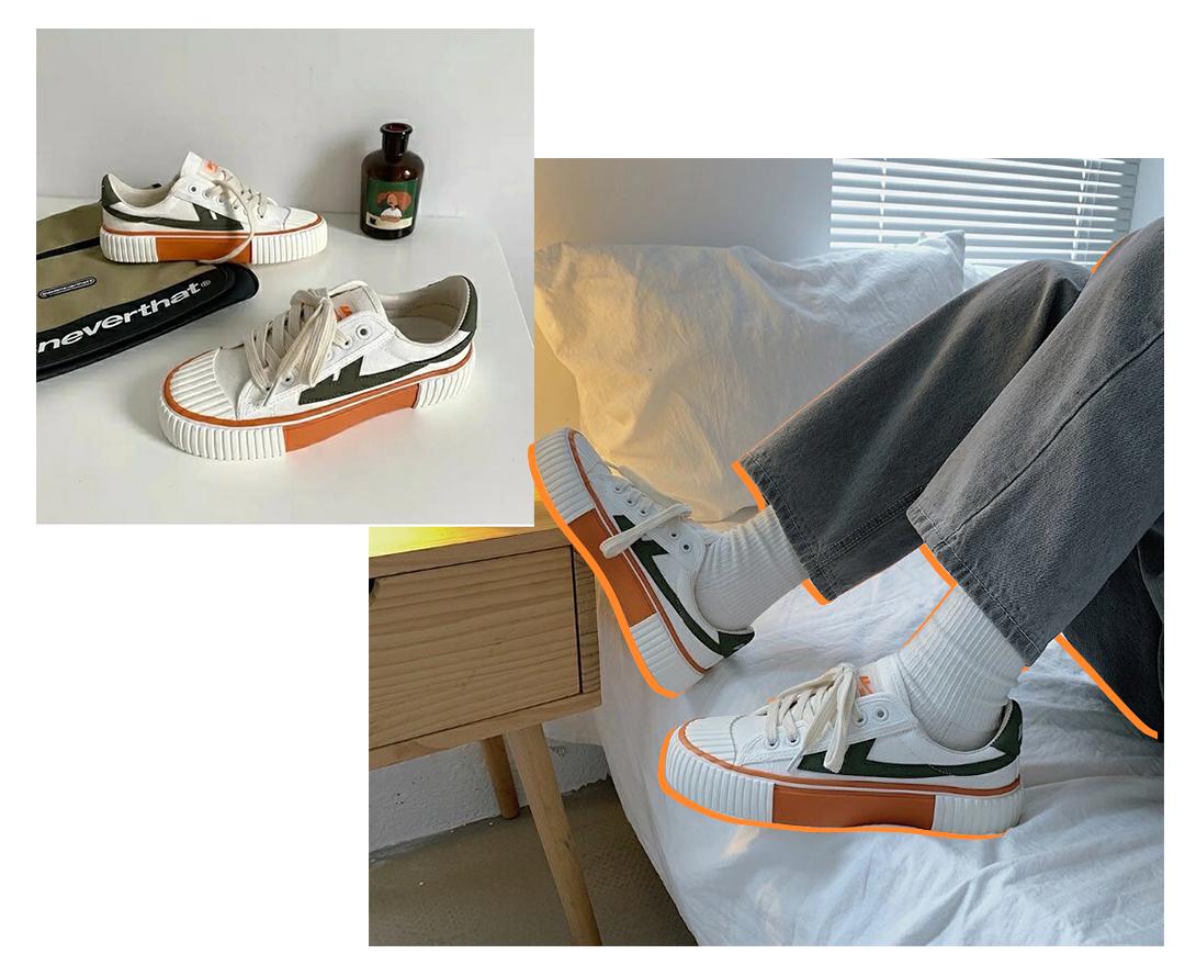 回力出了饼干鞋,脏橘和军绿色的结合很有青春校园感,看起来不那么单调。鞋底是那种软乎乎的硫化胶底,脚感没得说,还自带3cm增高效果。