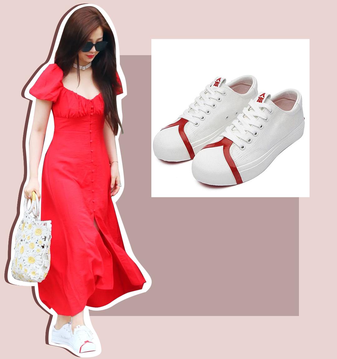人字鞋红+白的配色大气耐看,相比纯色小白鞋更亮眼,各种风格衣服都能Hold住,虞书欣街拍时就用它搭了红色小裙子。